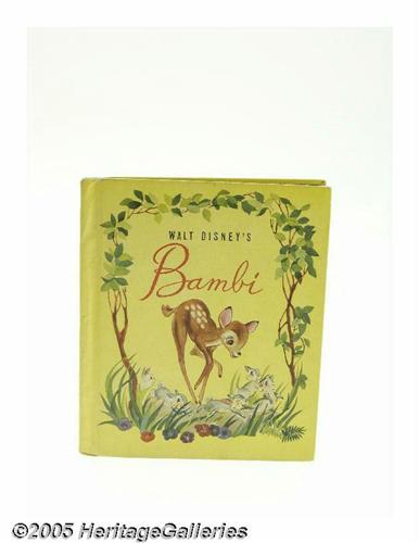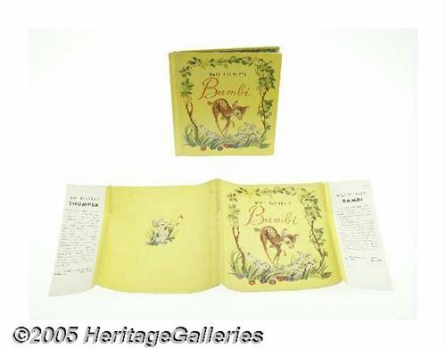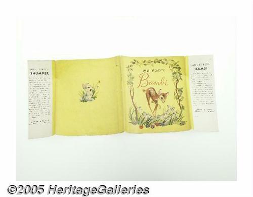 <B>Walt Disney's Bambi with Dust Jacket (Grosset and Dunlap, 1942).</B></I> One of the best-loved modern classics, <B>Bambi</B></I>, is brought to life in this hardcover edition, published by Grosset and Dunlap in 1942. A beautiful book with its original dust jacket intact, you'd have to search high and low to find this book in better condition. With its format and size, this little prize could be considered a precursor to the popular Golden Books which began being published shortly thereafter. Both the dust jacket and the book have almost unmentionable wear, and are both in Excellent condition. There is some pencil writing that has mostly been erased at the top of page two, otherwise the interior is bright, and clean. A princely book in pristine condition! <I>From the Larry Jacobs Collection.</B></I>