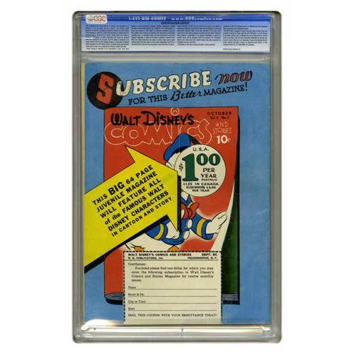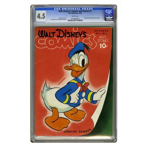 <B>Walt Disney's Comics and Stories #1 (Dell, 1940) CGC VG+ 4.5 White pages.</B></I> Here is the first issue of one of the longest-running comic series of all time, with Donald Duck newspaper strip reprints by Al Taliaferro, and Floyd Gottfredson's Mickey Mouse beginning in this issue. A clean copy with a nice spine and deep colors, only a crease down the back cover and other minor flaws keep this copy from grading higher. Overstreet 2005 VG 4.0 value = $3,200. CGC census 12/05: 3 in 4.5, 6 higher.