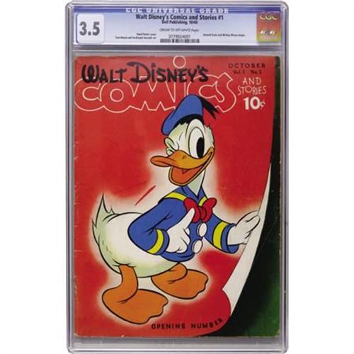 <B>Walt Disney's Comics and Stories #1 (Dell, 1940) CGC VG- 3.5 Cream to off-white pages.</B></I> The flagship title of Disney comic titles has been going (...and going...) for nearly 67 years now, enduring six publishing changes, and now closing in on 700 issues. Here's where it all started, the title's first issue, which essentially picked up where <B>Mickey Mouse Magazine </B></I>left off. We've offered surprisingly few nicer copies over the years than this copy, so give it a good looksee! Overstreet 2007 VG 4.0 value = $3,450. CGC census 5/07: 1 in 3.5, 16 higher.<BR><BR><b>Shipping:</b> Comics - Slabbed (certified) (<a target="_blank" href="http://www.heritageauctions.com/common/shipping.php">view shipping information</a>)