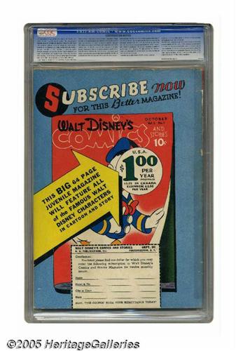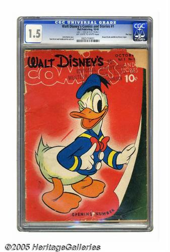 <B>Walt Disney's Comics and Stories #1 File Copy (Dell, 1940) CGC FR/GD 1.5 Off-white to white pages.</B></I> Here is the first issue of one of the longest-running comic series of all time, with Donald Duck newspaper strip reprints by Al Taliaferro, and Floyd Gottfredson's Mickey Mouse beginning in this issue. Featuring two of Walt Disney's most beloved comic characters, this copy is missing a chunk from the top right corner of the cover and shows a moderate degree of chipping and spine stress, but has clean, colorful covers, and great paper quality. A respectable copy of an important key issue. Overstreet 2005 GD 2.0 value = $1,600. CGC census 7/05: 2 in 1.5, 16 higher. <I>From the Random House Archives.</B></I>