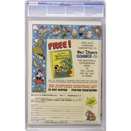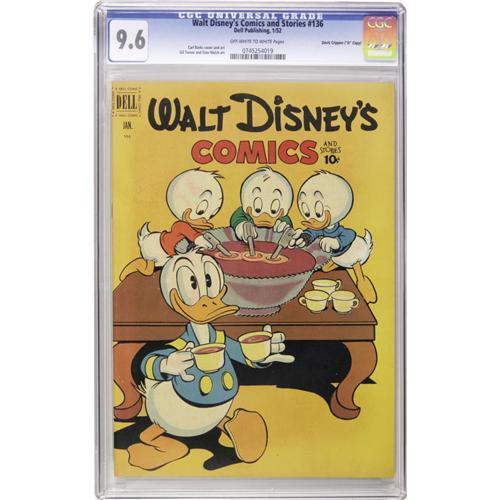 <B>Walt Disney's Comics and Stories #136 Davis Crippen ("D" Copy) pedigree (Dell, 1952) CGC NM+ 9.6 Off-white to white pages.</B></I> This is one of the nicest books in the entire Crippen collection! Carl Barks drew the cover as well as the inside. Overstreet 2006 NM- 9.2 value = $130. CGC census 9/06: 1 in 9.6, none higher. <I>From the Crippen Collection.</B></I><BR><BR><b>Shipping:</b> Slabbed Comic (<a target="_blank" href="http://www.heritageauctions.com/common/shipping.php">view shipping information</a>)