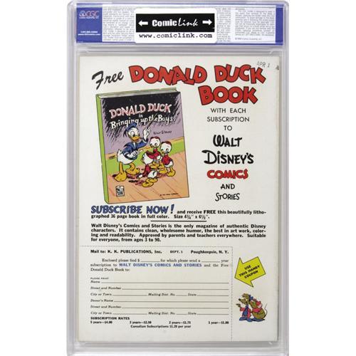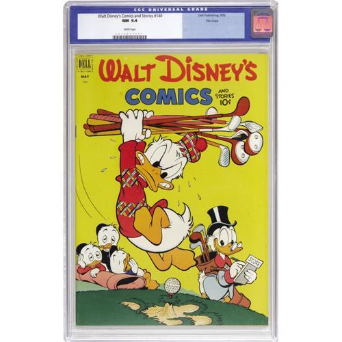 <B>Walt Disney's Comics and Stories #140 File Copy (Dell, 1952) CGC NM 9.4 White pages.</B></I> Stunning file copy that ranks at the top of CGC's census for the issue. Included here is the first appearance of Gyro Gearloose by Carl Barks and the second Barks' Uncle Scrooge cover (the third Uncle Scrooge cover ever). Overstreet 2006 NM- 9.2 value = $260. CGC census 9/06: 2 in 9.4, none higher.<BR><BR><b>Shipping:</b> Slabbed Comic (<a target="_blank" href="http://www.heritageauctions.com/common/shipping.php">view shipping information</a>)