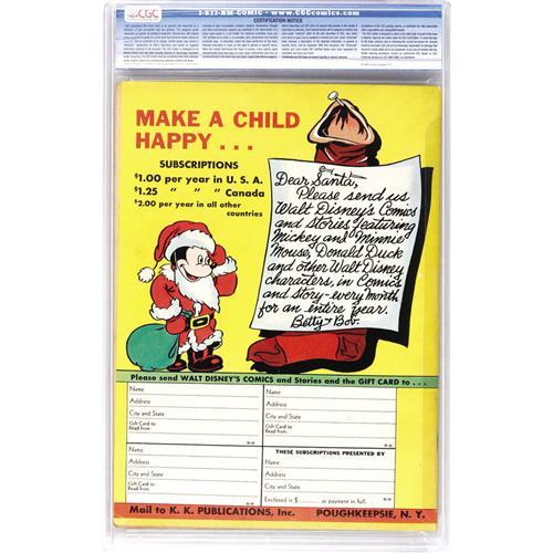 <B>Walt Disney's Comics and Stories #3 Davis Crippen ("D" Copy) pedigree (Dell, 1940) CGC FN 6.0 Off-white to white pages.</B></I> Fine is an amazing grade for early issues of this title - we're not surprised to see that only one copy has been graded higher by CGC to date. It's a big plus that Davis Crippen bought his comics off the newsstand, as many of the early <B>Comics and Stories</B></I> we've seen have been subscription copies with an unsightly address printed on the back - no such problem here! The issue's cover is credited to Disney staff artist Hank Porter. Note that a small plastic stabilizing peg is loose inside the CGC holder, not affecting the comic itself or the integrity of the holder. Overstreet 2006 FN 6.0 value = $732. CGC census 6/06: 1 in 6.0, 1 higher. <I>From the Crippen Collection.</B></I> <BR><BR><B>Important notice:</B> Heritage usually auctions material at the rate of 200-250 lots per hour. On some occasions eBay Live bid software or the Internet may not be able to keep up with the pace of the auction. We recommend placing a realistic absentee bid now as insurance to avoid disappointment. Occasionally the auctioneer may eliminate or reject an eBay Live bid, and the auctioneer may also reopen a lot after the close of the eBay live bidding (usually because we missed an audience bid), and may reject your bid even if it shows you as the winning bidder. By bidding via eBay Live, you agree that Heritage may award the lot to another bidder at its sole discretion under the circumstances described above or any other reasonable circumstances. Since eBay bids are not shown to us until we open the lot on the floor, we treat those bids just like floor bids. In most cases the floor responds before the eBay bid is presented to us, due to Internet lag time, so for consistency we have made it a policy that floor bids are always considered first over tie eBay live bids. Also please note that all Heritage lots purchased through eBay Live carry a 22.5% Buyer's Premium. Please make sure you read the Terms and Conditions before you bid. This lot is being auctioned in conjunction with a live floor auction by Heritage Auction Galleries. All final auction and invoice information will be supplied by Heritage Auction Galleries, and all other information should be considered preliminary. Lot:41001 <BR><BR><B>Winning Notification and Billing:</B> After the FINAL session in this auction is complete, Heritage will send e-mail and snail mail invoices. This process normally takes several days. All final auction and invoice information will be supplied by Heritage Auction Galleries, and all other information should be considered preliminary. <BR><BR>This auction will be conducted on a live auction floor and over the Internet through eBay Live. If you choose to place an absentee bid, please take a moment to <font color='#0000ff'><u><a href='http://pages.ebay.com/liveauctions/help/before/laabsentee.html'>learn how eBay Live absentee bidding works</a></u></font><font color='#000000'>