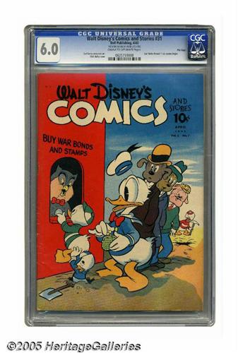 <B>Walt Disney's Comics and Stories #31 File Copy (Dell, 1943) CGC FN 6.0 Cream to off-white pages.</B></I> New Donald Duck stories written and drawn by Carl Barks began with this issue, which also sports a nice Walt Kelly cover -- making it the third-most valuable issue in the series (behind #1 and 2, of course). This particular copy displays some spine stress and faint wear to the edges, but the cover is glossy and bright. Overstreet 2005 FN 6.0 value = $900. CGC census 7/05: 1 in 6.0, 7 higher. <I>From the Random House Archives.</B></I>