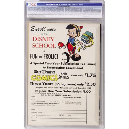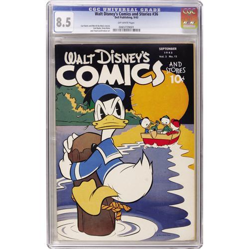 <B>Walt Disney's Comics and Stories #36 (Dell, 1943) CGC VF+ 8.5 Off-white pages.</B></I> Three of the top pencil-wielders in all of Disneydom contributed here -- witness Carl Barks on Donald Duck, Floyd Gottfredson on Mickey Mouse, and Walt Kelly on the Gremlins! Overstreet 2006 VF 8.0 value = $506; VF/NM 9.0 value = $803. CGC census 3/07: 3 in 8.5, 2 higher.<BR><BR><b>Shipping:</b> Comics - Slabbed (certified) (<a target="_blank" href="http://www.heritageauctions.com/common/shipping.php">view shipping information</a>)