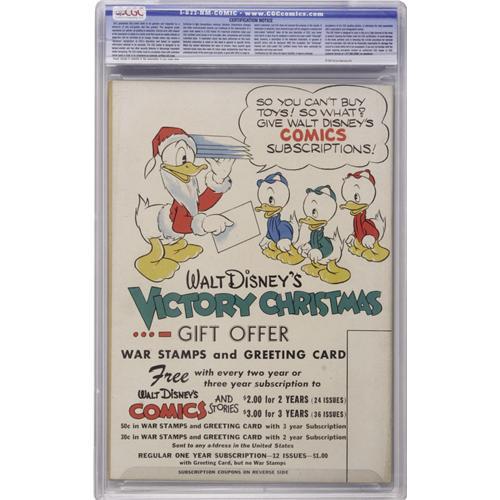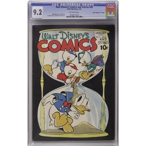 <B>Walt Disney's Comics and Stories #40 Davis Crippen ("D" Copy) pedigree (Dell, 1944) CGC NM- 9.2 Off-white pages.</B></I> Walt Kelly drew this issue's cover, and Carl Barks and Carl Buettner added interior art. Overstreet 2006 NM- 9.2 value = $750. CGC census 9/06: 1 in 9.2, none higher. <I>From the Crippen Collection</B></I>.<BR><BR><b>Shipping:</b> Slabbed Comic (<a target="_blank" href="http://www.heritageauctions.com/common/shipping.php">view shipping information</a>)