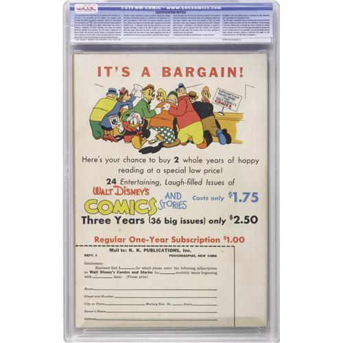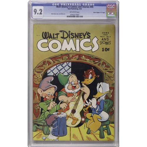 <B>Walt Disney's Comics and Stories #45 Davis Crippen ("D" Copy) pedigree (Dell, 1944) CGC NM- 9.2 Off-white pages.</B></I> Nazis appear in this issue's Mickey Mouse story by Floyd Gottfredson! The issue also has Carl Barks interior art. The cover is by Walt Kelly. Overstreet 2006 NM- 9.2 value = $600. CGC census 9/06: 2 in 9.2, none higher. <I>From the Crippen Collection</B></I>.<BR><BR><b>Shipping:</b> Slabbed Comic (<a target="_blank" href="http://www.heritageauctions.com/common/shipping.php">view shipping information</a>)
