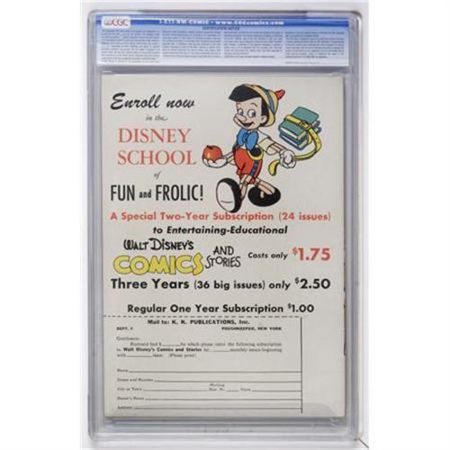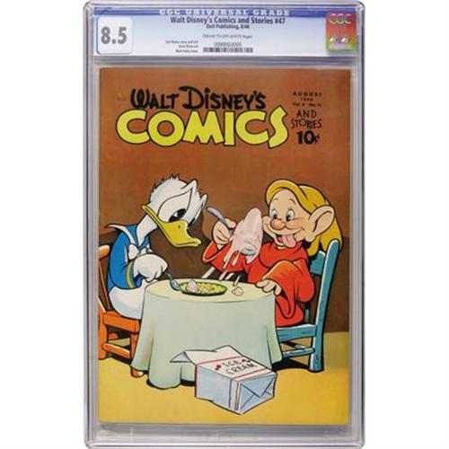 <B>Walt Disney's Comics and Stories #47 (Dell, 1944) CGC VF+ 8.5 Cream to off-white pages.</B></I> Carl Barks story and art. Vivie Risto art, Walt Kelly cover. Nazis appear in the Mickey Mouse story by Floyd Gottfredson. Overstreet 2007 VF 8.0 value = $293; VF/NM 9.0 value = $472. CGC census 6/07: 1 in 8.5, 1 higher.<BR><BR><b>Shipping:</b> Comics - Slabbed (certified) (<a target="_blank" href="http://www.heritageauctions.com/common/shipping.php">view shipping information</a>)