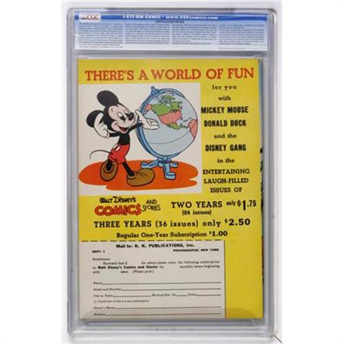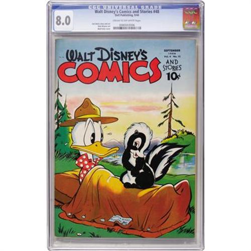 <B>Walt Disney's Comics and Stories #48 (Dell, 1944) CGC VF 8.0 Cream to off-white pages.</B></I> Carl Barks story and art. Dick Moores art. Walt Kelly cover. Nazis appear in Floyd Gottfredson's Mickey Mouse story. Overstreet 2007 VF 8.0 value = $293. CGC census 6/07: 1 in 8.0, 2 higher.<BR><BR><b>Shipping:</b> Comics - Slabbed (certified) (<a target="_blank" href="http://www.heritageauctions.com/common/shipping.php">view shipping information</a>)