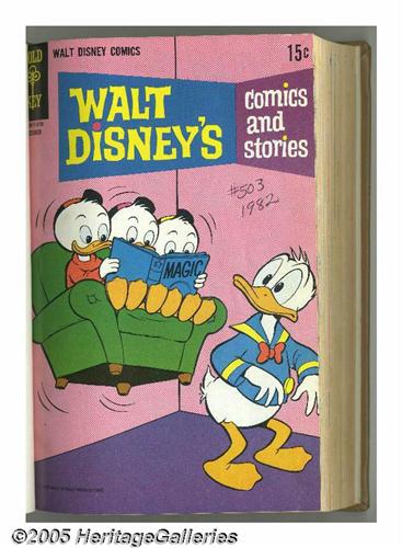 <B>Walt Disney's Comics and Stories Bound Volumes (Gold Key, 1969-73).</B></I> These are Gold Key file copies which have been trimmed and bound into three hardcover volumes. Included here are issues 349-360 and 373-396. The first volume has handwritten notations on the cover and/or first page of almost every comic, usually information on if and in what issue the stories had been reprinted. Other than that, the condition of the comics is superb. Approximate Overstreet VG 4.0 value for group = $200. <I>From the Random House Archives.</B></I>