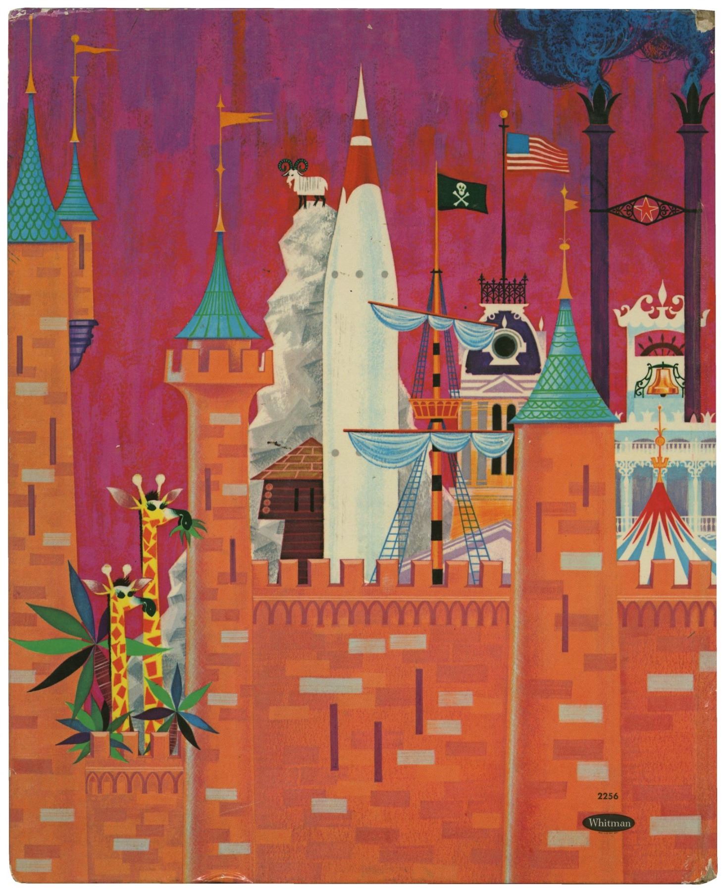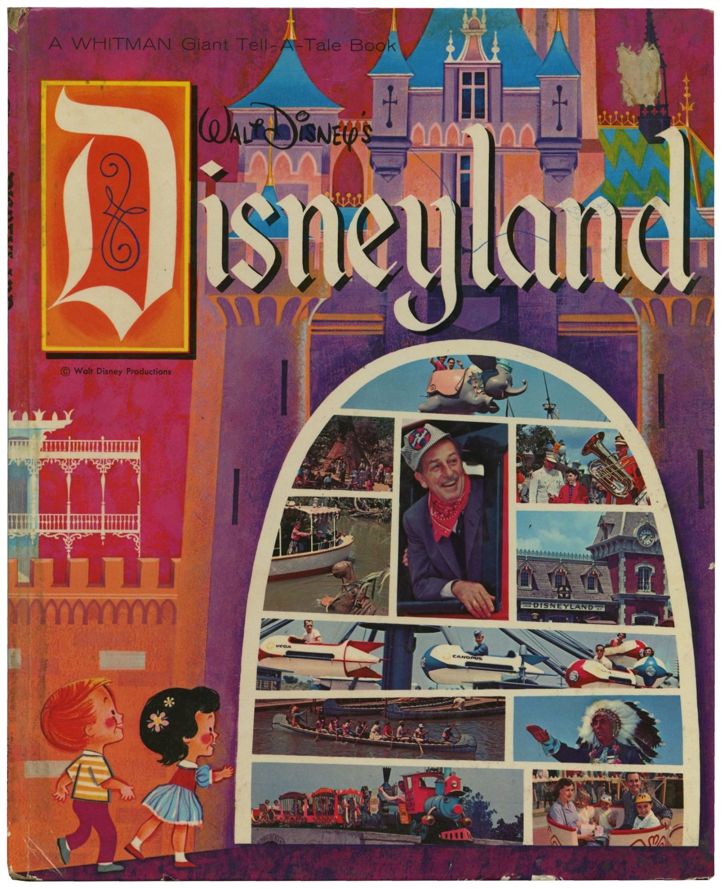 (Disneyland, 1964) A rare hardcover Whitman Giant Tell-A-Tale book titled, "Walt Disney's Disneyland." This oversized book is full of wonderful vintage photos of Disneyland in its prime. The Enchanted Tiki Room is the newest attraction featured in this book. Measuring 12.5"x10.25", this book is in good condition with some pen markings and surface scratches to the front cover and the original owner's name written inside, with edge-wear and some damage to the spine.