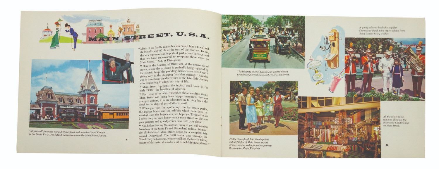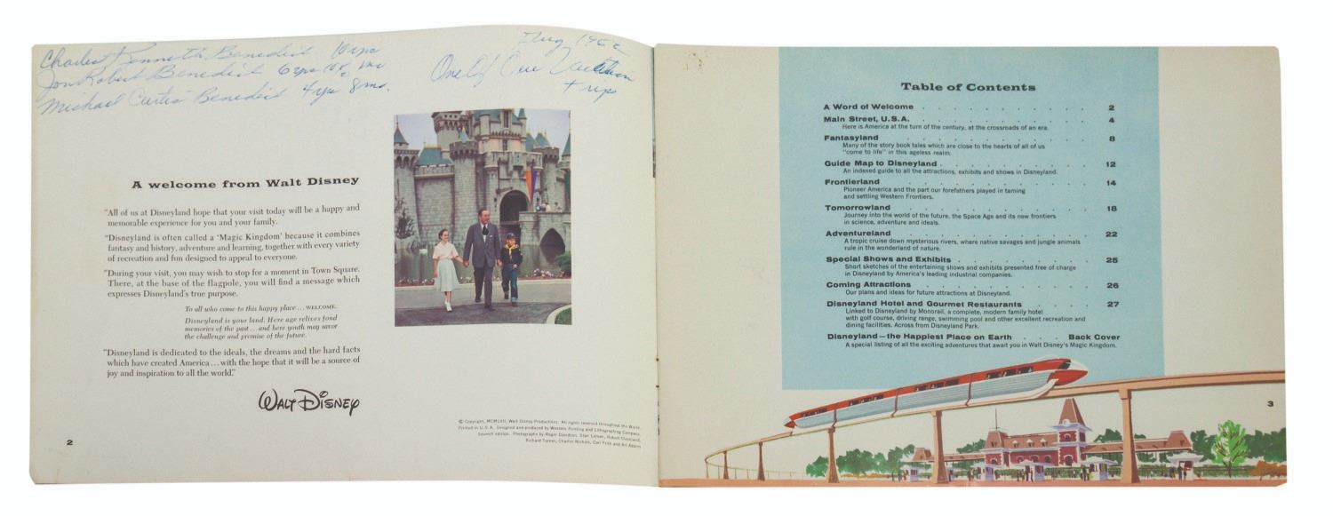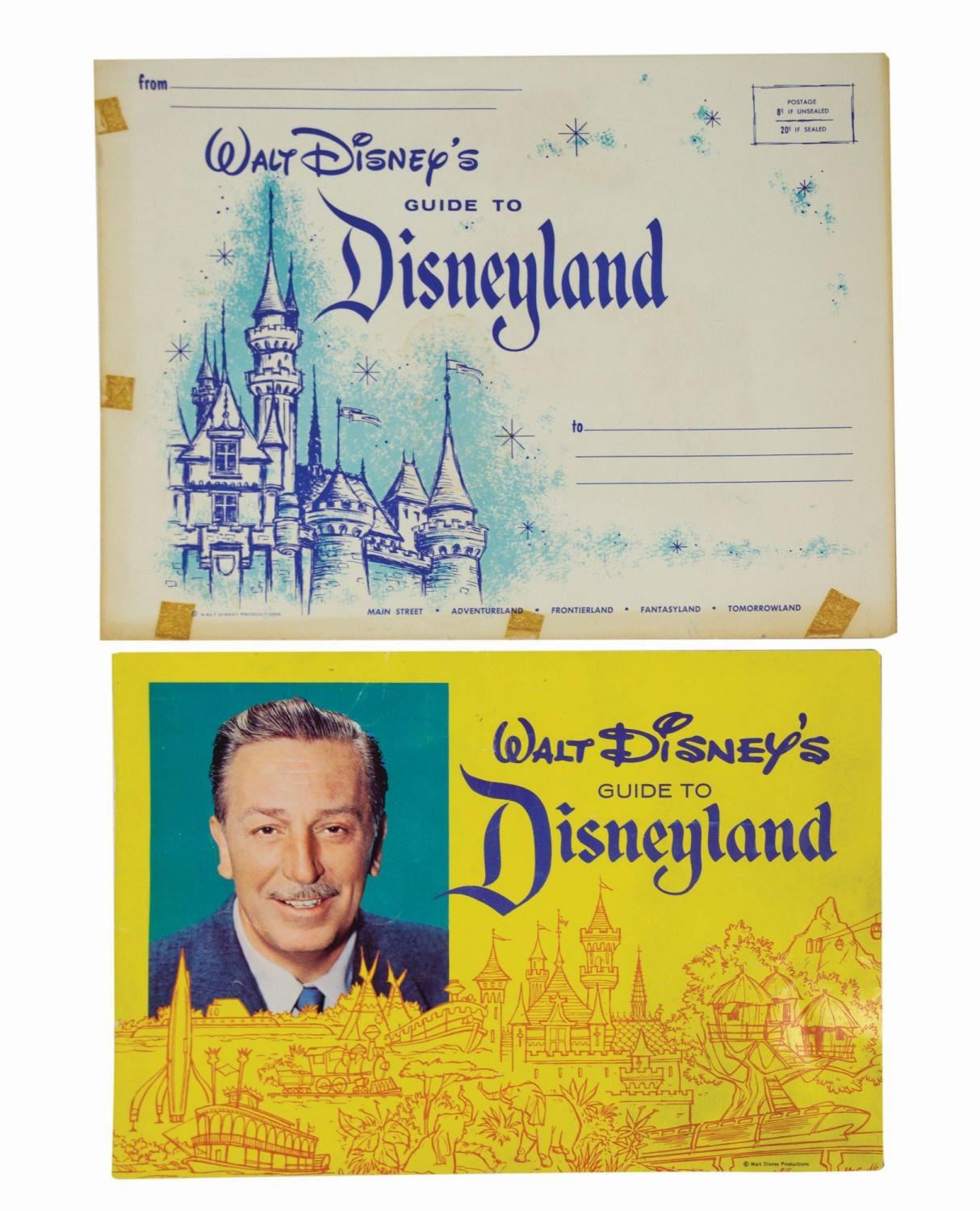 (Disneyland, 1962) A "Walt Disney's Guide to Disneyland" souvenir book. It features sections highlighting the attractions, special shows, exhibits and restaurants of all five lands. Measuring 11.5"x8" the 27-page souvenir guidebook, is in good used condition, with minor scuffing and creasing to the cover and pages throughout. The interior cover bears hand-written notation pertaining to children's ages during a family vacation. Also included, is the official mailing envelope created specifically for "Walt Disney's Guide to Disneyland." The envelope is in good condition with minor discoloration, tiny stains, and yellowing from where tape was once applied.