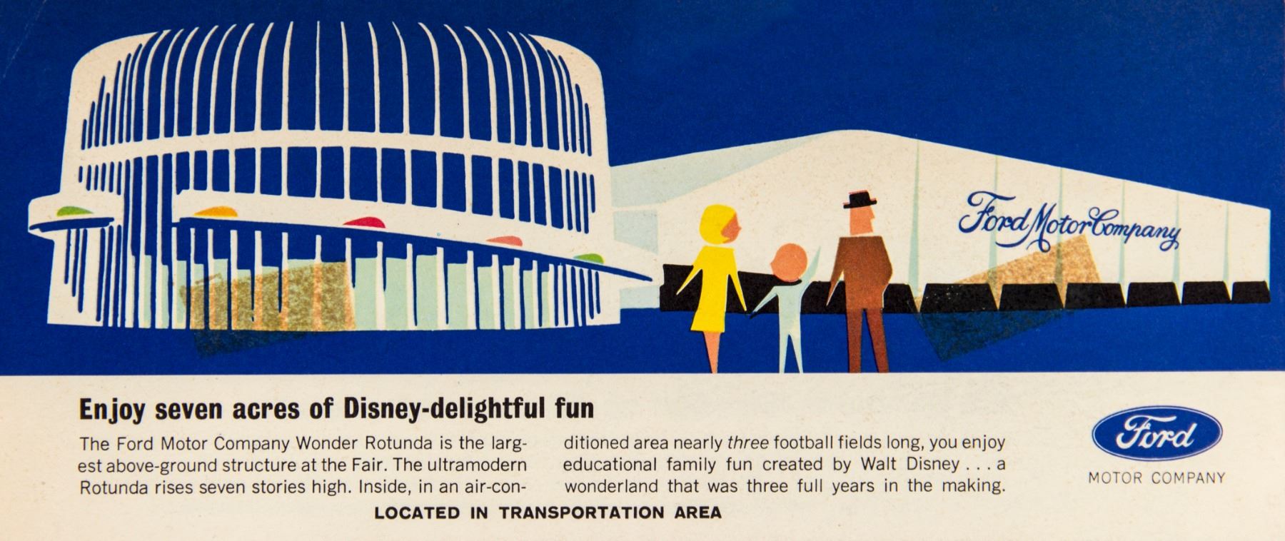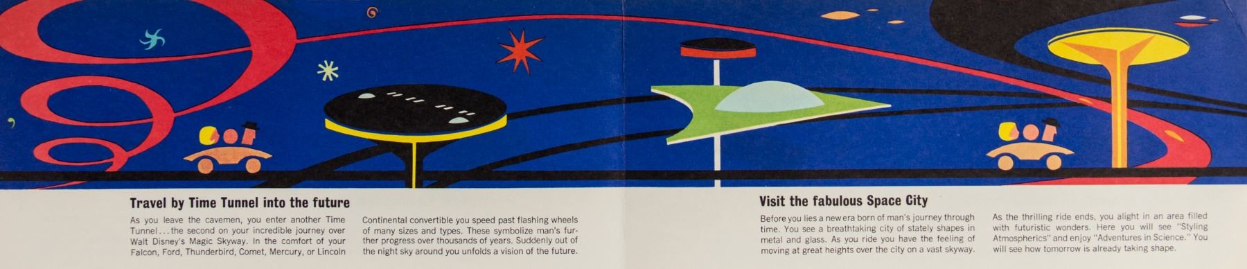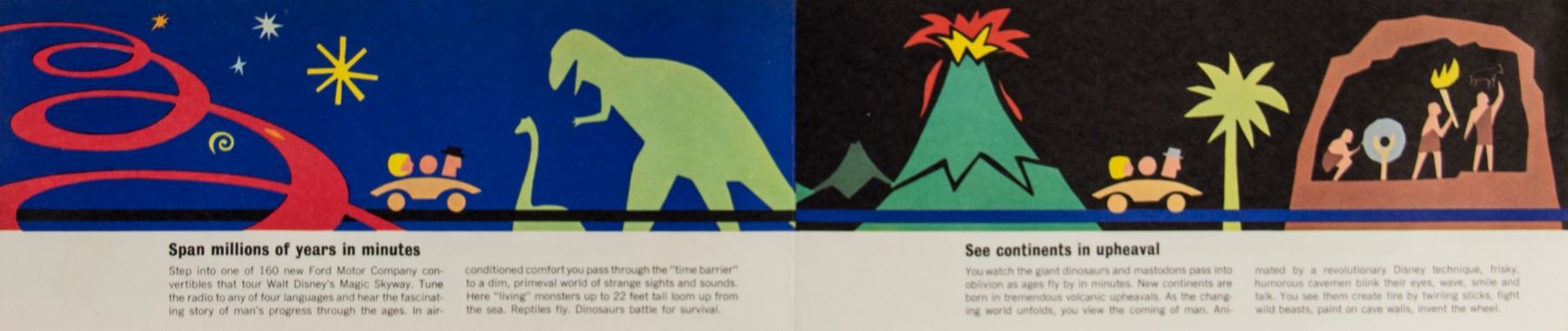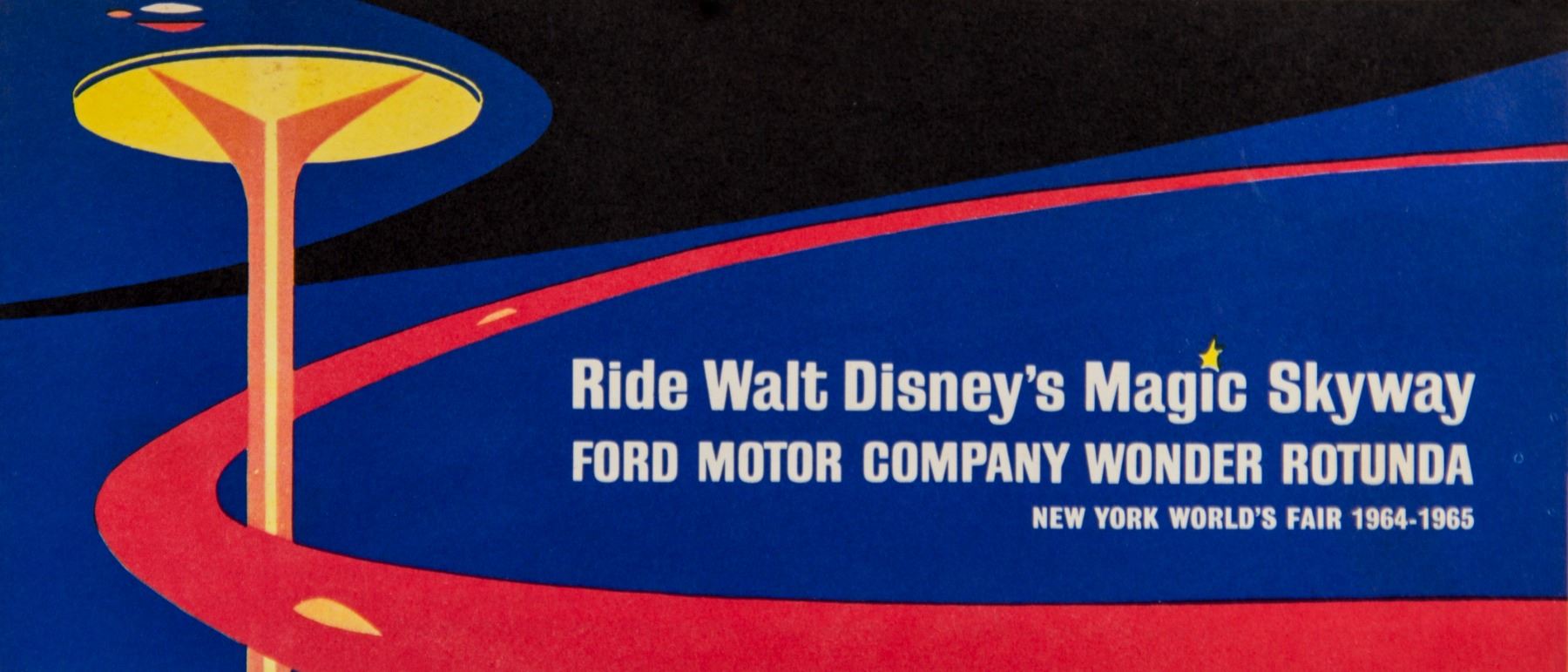 (World's Fair, 1964) A very rare hand-out advertising for Walt Disney's "Magic Skyway" at the Ford pavilion during the 1964-65 New York World's Fair. The flyer also highlight Ford's "Wonder Rotunda" and features several illustrations on both sides of the long pamphlet. While folded, this item measures 4"x9.25", but expands to a long 4"x37". This item is in fine condition with minimal wear including two spots of tape discoloration on the back.