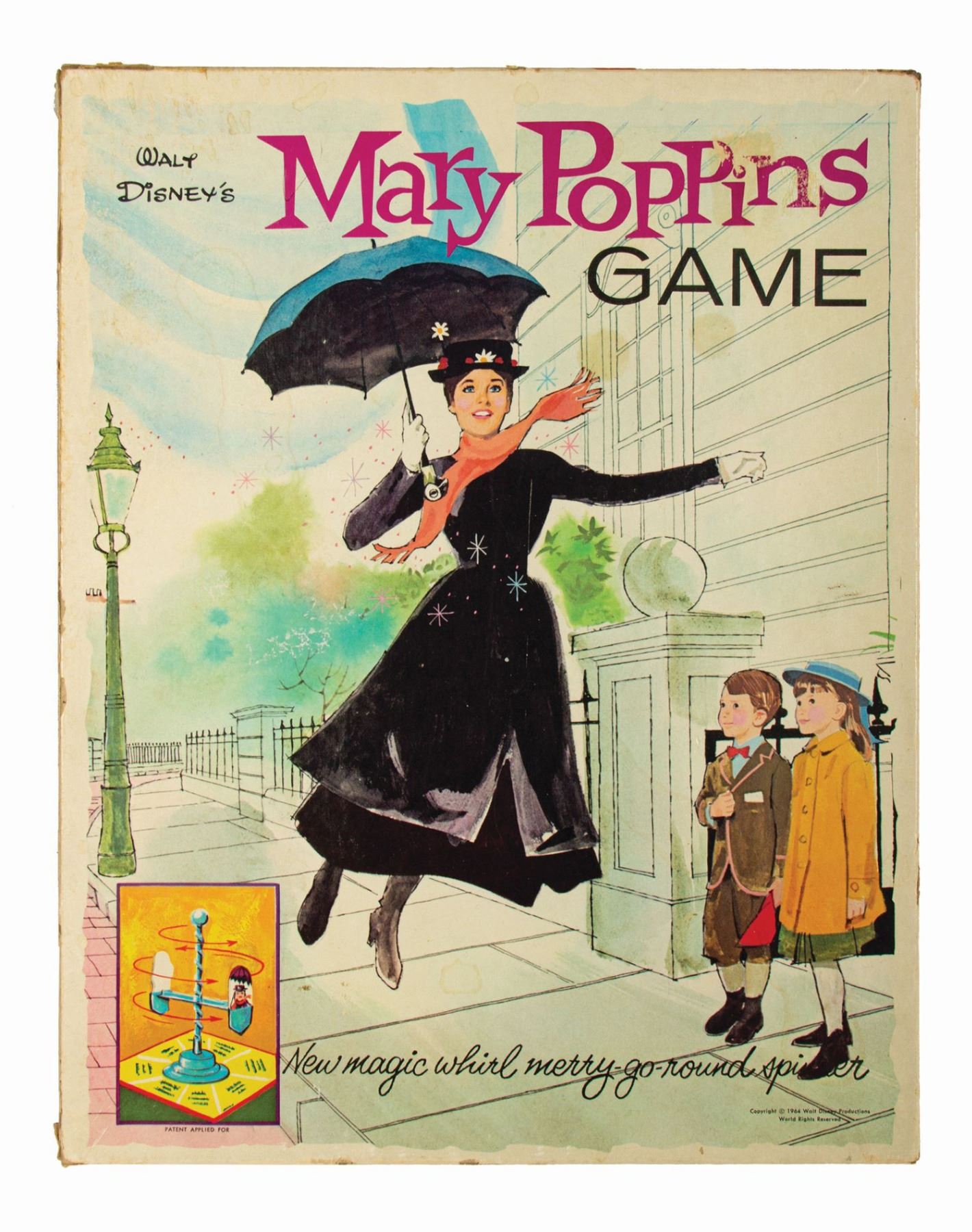 (Disney, 1964) A Mary Poppins board game manufactured by Whitman. The 2-4 player game retains all the original pieces, and the cardboard Mary Poppins and Bert figures are un-punched from their original card. The original game box measures 15.5”x12” and 1.75” deep and is in good condition. It exhibits some split corners repaired with tape, edge wear, minor darkening from age, and moisture staining to lid. The game components remain in very good condition.