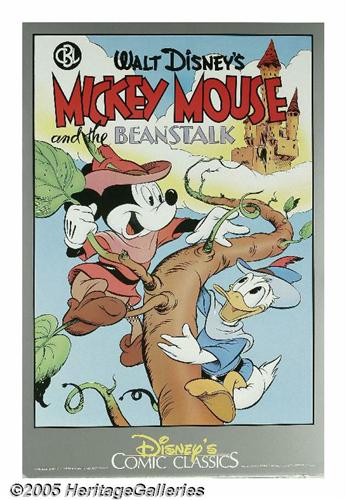 <B>Walt Disney's Mickey Mouse and the Beanstalk Print (Another Rainbow, 1987).</B></I> Originally released as part of the feature "Fun and Fancy Free," "Mickey and the Beanstalk" is the story of Jack and the Beanstalk, with the role of Jack split into three and played by Mickey Mouse, Donald Duck and Goofy. To save Happy Valley from extinction, our heroes must rescue the singing harp from a selfish giant. At the top of the stalk, high above the clouds, Mickey Mouse and Donald Duck approach the castle of the giant in this first-class print which was published by Another Rainbow Publishing Company. This print is number 2 in the Comic Book Library series and measures 24" x 36". In Excellent condition.
