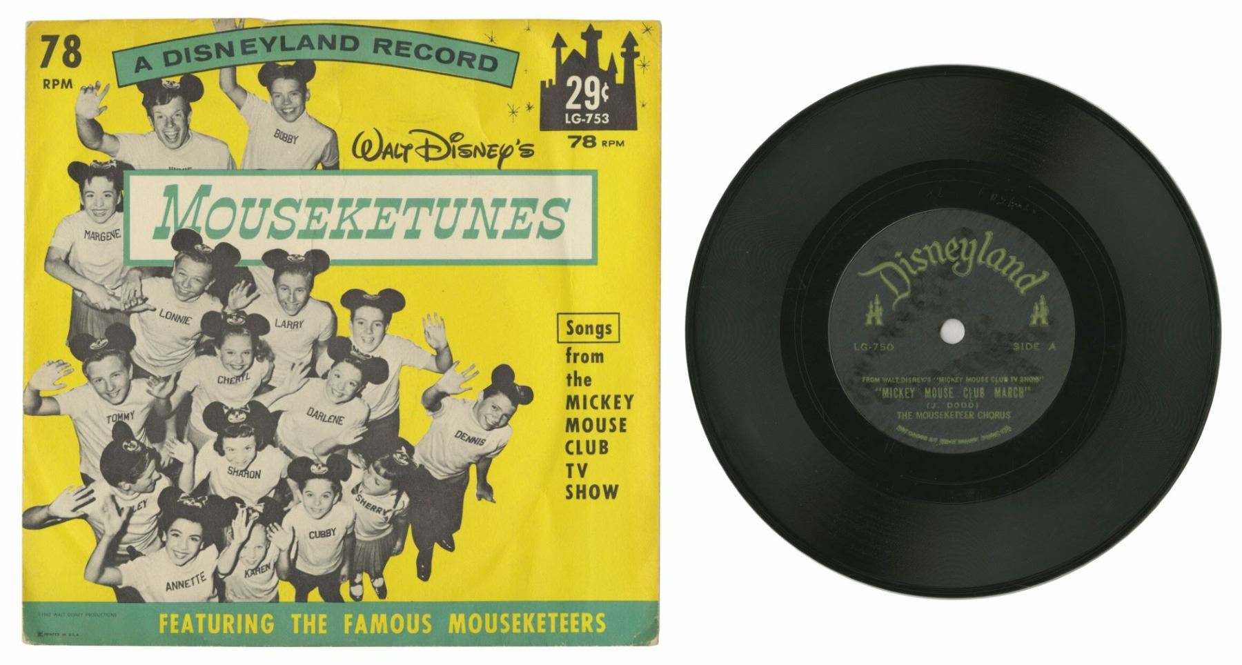 (Disneyland, 1962) A 78 rpm Little Gem record of music from the Mickey Mouse Club TV show. The cover features a photo of the cast, including Annette Funicello, Cubby O'Brien, Karen Pendleton, Sherry Alberoni, and more. This 6" record is enclosed within a 7"x7" sleeve. The vinyl is in very good condition with some scuffing and minor scratches from use. The cover is in good to very good condition with some wear to the edges and seam from use.
