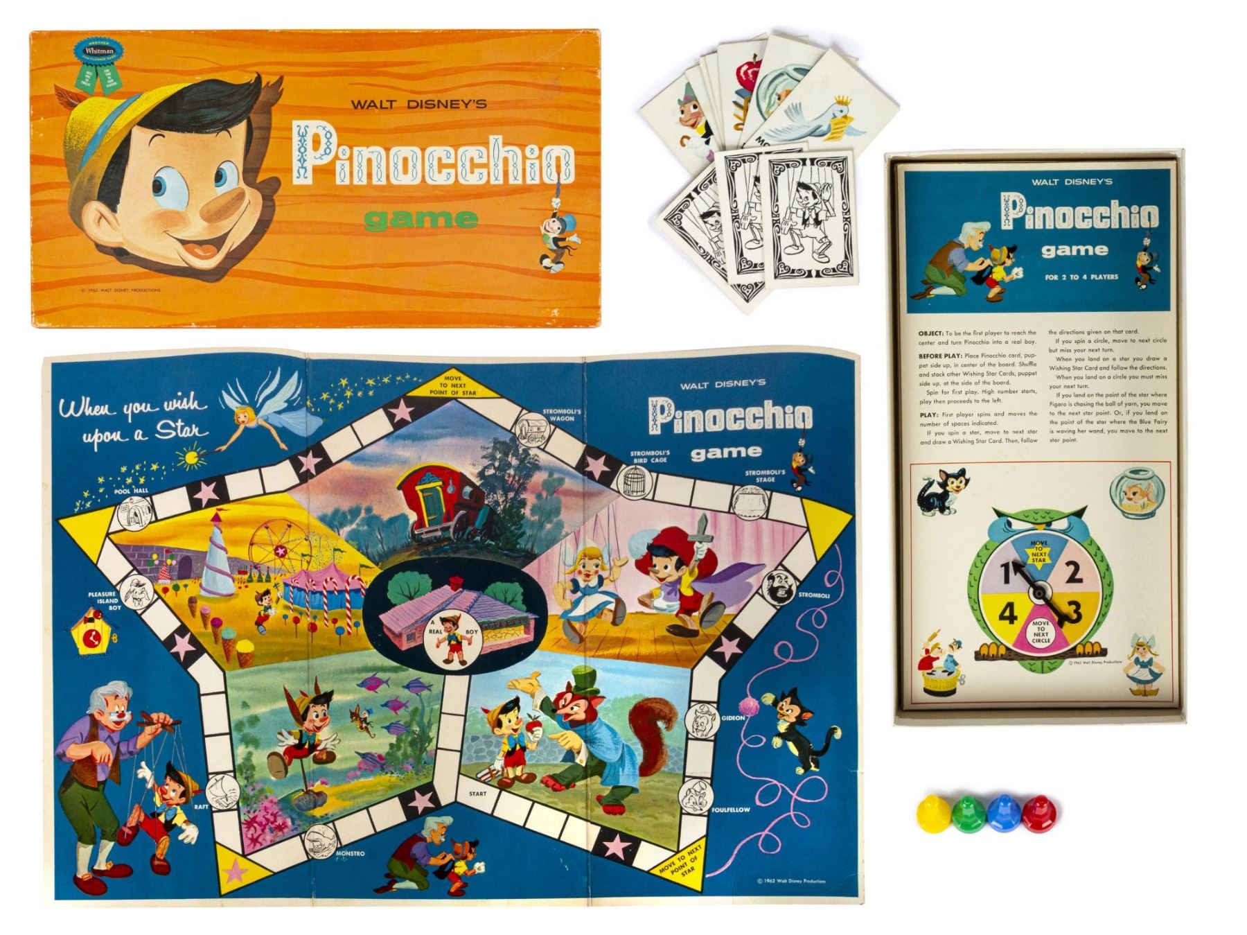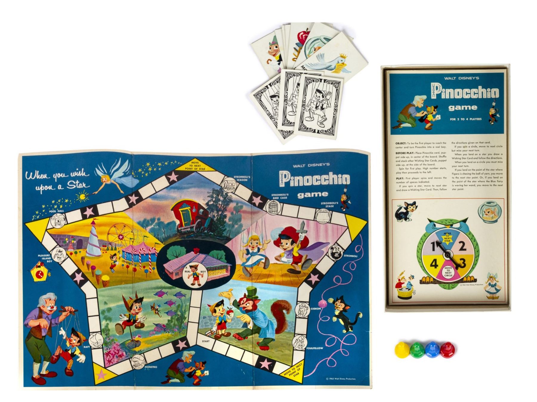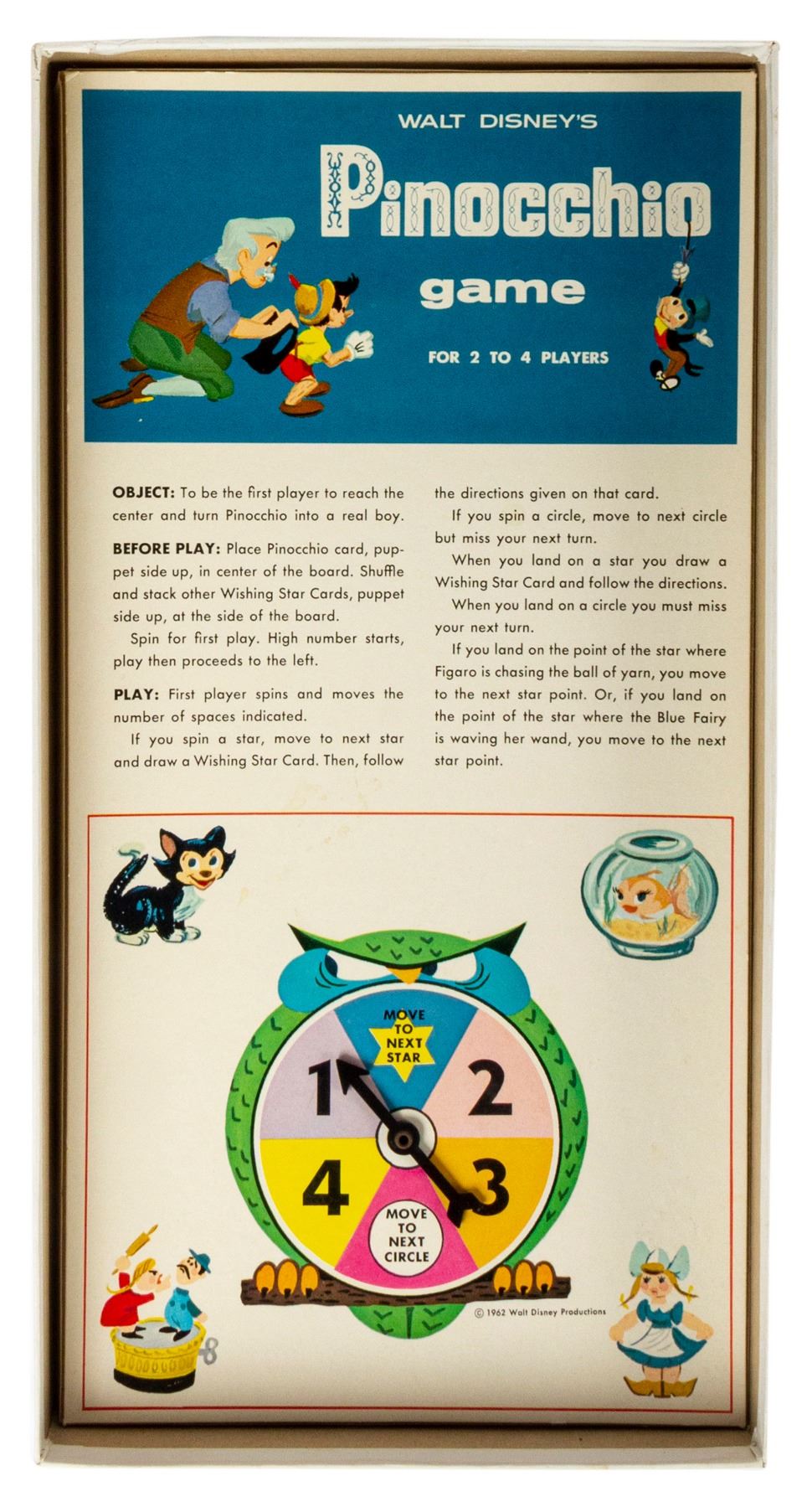 (Whitman, 1962) A vintage board game created by Whitman which is based on the feature film Pinocchio. The game is complete in its original box and contains: a game board, 4 player pieces, 10 Pinocchio cards, and one spinner. The box measures 8.25"x15.75" and 1.75" deep. The condition is very good, with expected wear to the box from age and some spots of discoloration. The board itself is in good condition, with some edge-wear from folding and minor creasing.