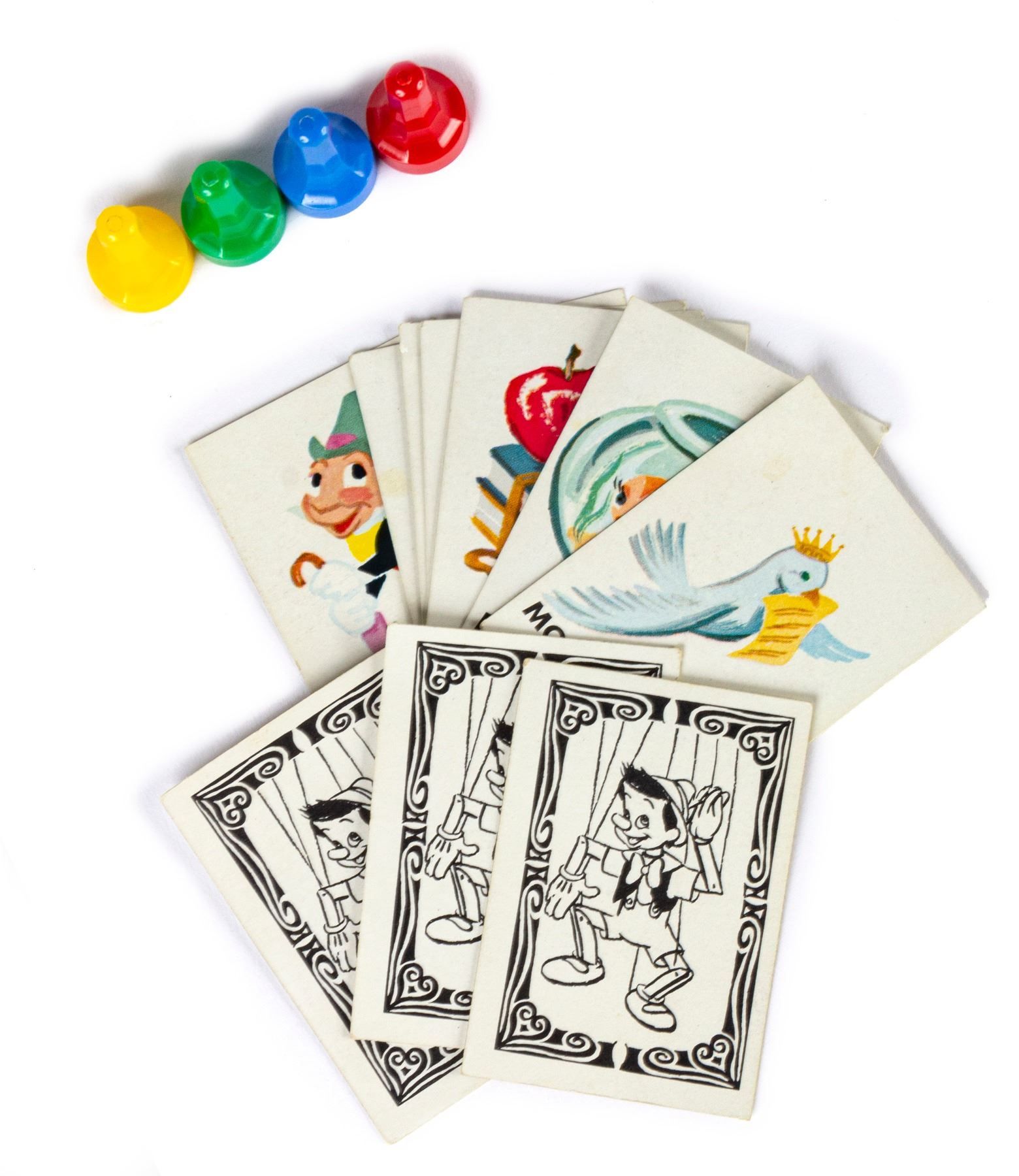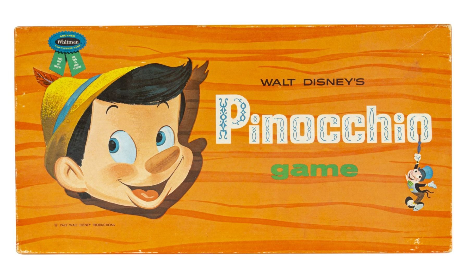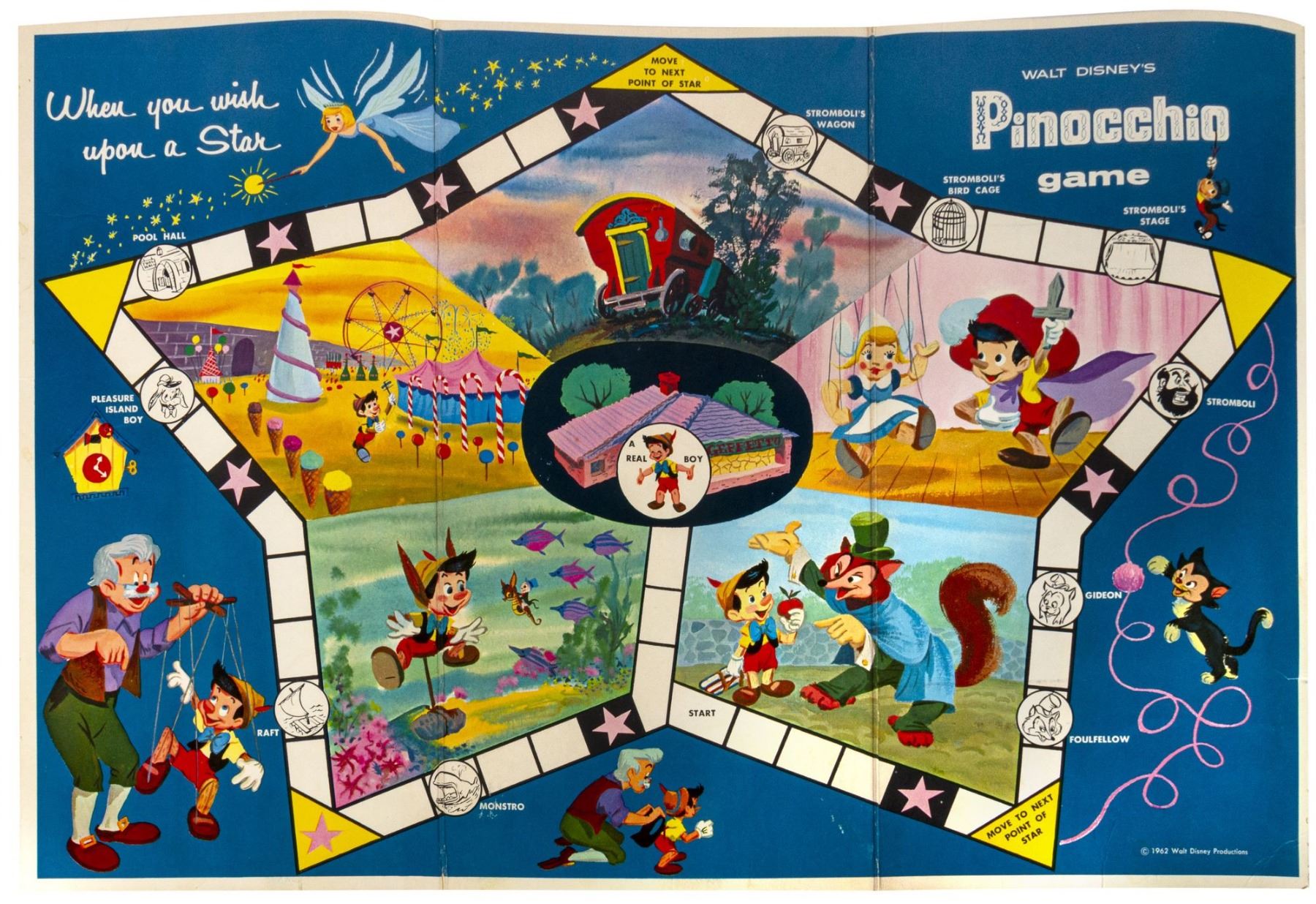 (Whitman, 1962) A vintage board game created by Whitman which is based on the feature film Pinocchio. The game is complete in its original box and contains: a game board, 4 player pieces, 10 Pinocchio cards, and one spinner. The box measures 8.25"x15.75" and 1.75" deep. The condition is very good, with expected wear to the box from age and some spots of discoloration. The board itself is in good condition, with some edge-wear from folding and minor creasing.