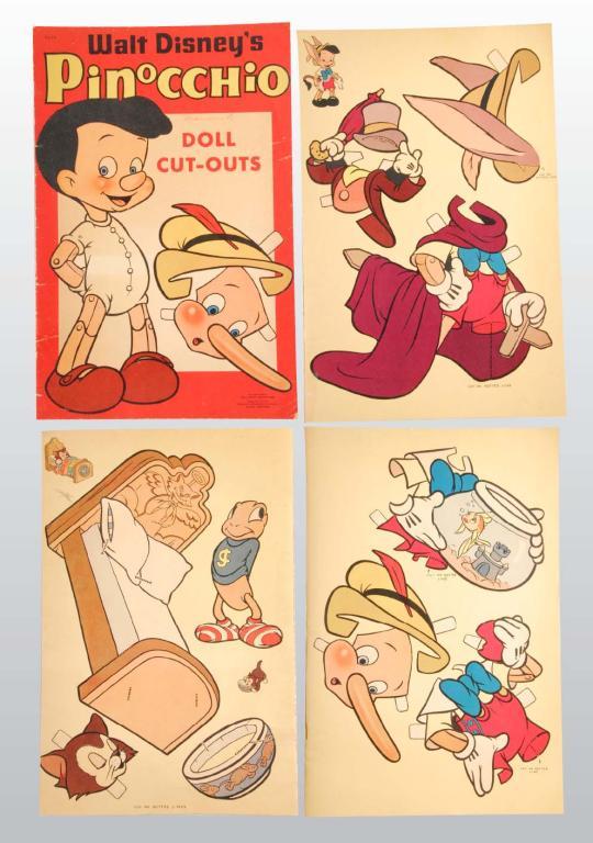 Description Dated 1939. The red-trimmed cover of this edition features Pinocchio, and a mask with his 'lying' nose. Jiminy Cricket, Figaro's head, and a bed are on the yellow back cover. The six clothing pages include characters, accessories and various outfits for Pinocchio and pals. The colors are ultra-bright Disney. This is a fine example of a paper doll rendering of Disney's version of the classic children's story.