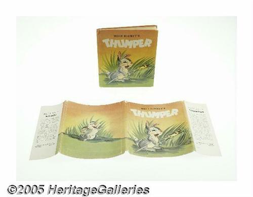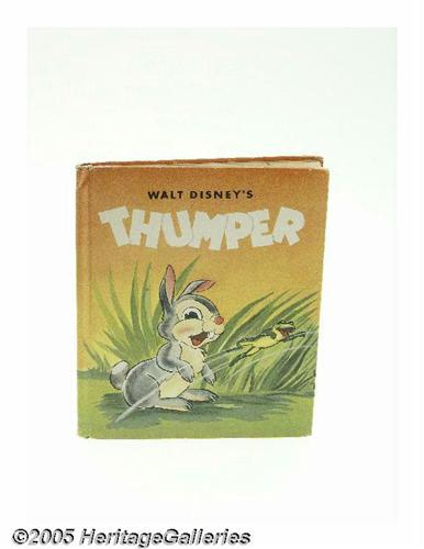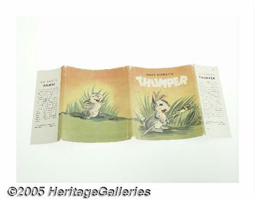 <B>Walt Disney's Thumper with Dust Jacket (Grosset and Dunlap, 1942).</B></I> The impish rabbit Thumper thumps his way into his first book in this fine hardcover first edition published by Grosset & Dunlap in 1942. With its scarce dust jacket still present, this is a bright, pristine copy of a scarce title. The dust jacket has a bit of wear and a water spot, but it's still in great shape. The cover has some slightly worn corners and spine ends, otherwise it's a fine, fresh copy. Chock full of black and white and color illustrations, the interior pages bear little aging, and the binding is tight. An Excellent copy overall. <I>From the Larry Jacobs Collection.</B></I>