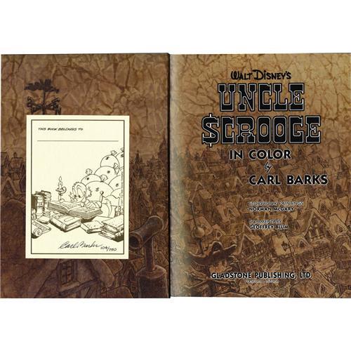 <B>Walt Disney's Uncle Scrooge in Color (Gladstone, 1987).</B></I> This is #104 of the 750 copies that were autographed by Carl Barks and comes packaged in a slipcover adorned with the "Always Another Rainbow" portrait of young Scrooge McDuck. Published by Gladstone to commemorate the 40th anniversary of Uncle Scrooge McDuck's debut in 1947 in "Christmas on Bear Mountain", a classic Carl Barks comic book story. Gladstone published "Uncle Scrooge in Color", a lavish hardcover volume devoted to the world's richest duck, and no expense was spared to make this book the definitive 40th anniversary commemorative edition. It measures a large 9" X 12" and is hardbound in cloth with a dust jacket printed on heavy glossy stock. The interior pages are also printed on heavy, high-quality stock, chosen for its ability to hold color faithfully in the printing process. Barks' signature can be found on an <I>ex libris</B></I> book plate on the inside of the front cover. In Excellent condition. <BR><BR><B>Important notice:</B> Heritage usually auctions material at the rate of 200-250 lots per hour. On some occasions eBay Live bid software or the Internet may not be able to keep up with the pace of the auction. We recommend placing a realistic absentee bid now as insurance to avoid disappointment. Occasionally the auctioneer may eliminate or reject an eBay Live bid, and the auctioneer may also reopen a lot after the close of the eBay live bidding (usually because we missed an audience bid), and may reject your bid even if it shows you as the winning bidder. By bidding via eBay Live, you agree that Heritage may award the lot to another bidder at its sole discretion under the circumstances described above or any other reasonable circumstances. Since eBay bids are not shown to us until we open the lot on the floor, we treat those bids just like floor bids. In most cases the floor responds before the eBay bid is presented to us, due to Internet lag time, so for consistency we have made it a policy that floor bids are always considered first over tie eBay live bids. Also please note that all Heritage lots purchased through eBay Live carry a 22.5% Buyer's Premium. Please make sure you read the Terms and Conditions before you bid. This lot is being auctioned in conjunction with a live floor auction by Heritage Auction Galleries. All final auction and invoice information will be supplied by Heritage Auction Galleries, and all other information should be considered preliminary. Lot:41001 <BR><BR><B>Winning Notification and Billing:</B> After the FINAL session in this auction is complete, Heritage will send e-mail and snail mail invoices. This process normally takes several days. All final auction and invoice information will be supplied by Heritage Auction Galleries, and all other information should be considered preliminary. <BR><BR>This auction will be conducted on a live auction floor and over the Internet through eBay Live. If you choose to place an absentee bid, please take a moment to <font color='#0000ff'><u><a href='http://pages.ebay.com/liveauctions/help/before/laabsentee.html'>learn how eBay Live absentee bidding works</a></u></font><font color='#000000'>