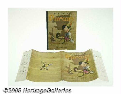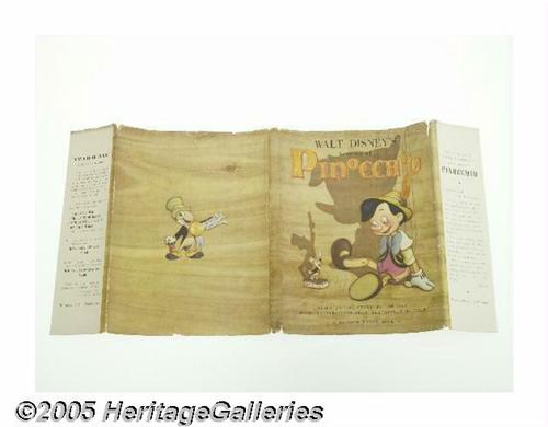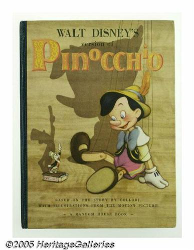 <B>Walt Disney's Version of Pinocchio with Dust Jacket - Large (Random House, 1939).</B></I> Here is Walt Disney's version of Pinocchio, based on the story by Collodi, with illustrations from the motion picture. This 72 page book measures 8.5" x 11.5". "Pinocchio" has been hailed as Disney's greatest film. This book was first published in 1939, just prior to the 1940 film release, and it is illustrated with the story sketches and animation roughs on which the Pinocchio animation was based. This beauty contains 34 color illustrations and 174 pictures in all, including the half-page deep, two-page wide color illustration of Monstro the whale about to swallow Pinocchio. The illustrated endpapers and a blue cloth spine really stand out. There is some chipping and bumped corners, but the overall condition is Fine condition. Includes the original dust jacket, which shows some wear and tearing along the corners and edges. <I>From the Larry Jacobs Collection.</B></I>