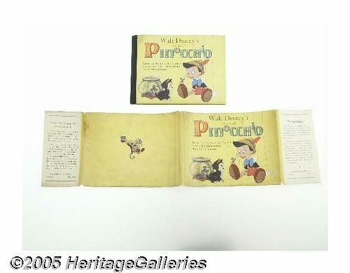 <B>Walt Disney's Version of Pinocchio with Dust Jacket - Small (Grosset and Dunlap, 1939).</B></I> The story of mischievous, prankish Pinocchio comes delightfully alive in this book made from Disney's enchanting movie, published by Grosset & Dunlap in 1939. Text is accompanied by black and white and by color illustrations. Measures approximately 9" x 7". Note written in pencil on inside front cover: "David from Uncle Joe". Like so many of the books in this collection, the dust jacket is present, understandably demonstrating some wear after 65 years! The book itself is in Fine condition. <I>From the Larry Jacobs Collection.</B></I>
