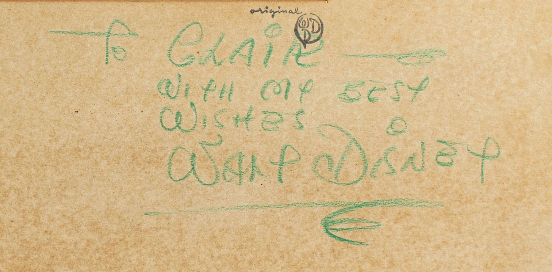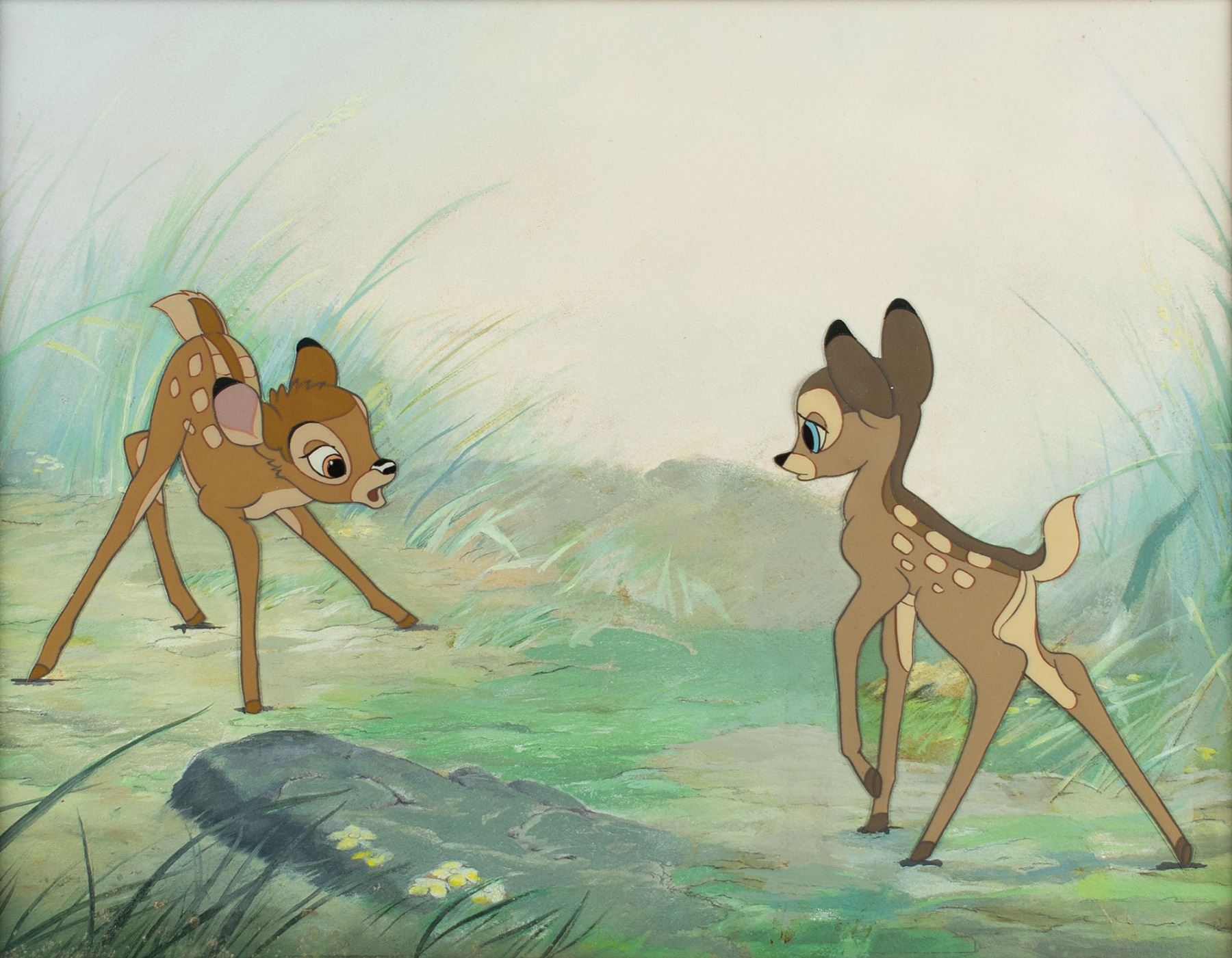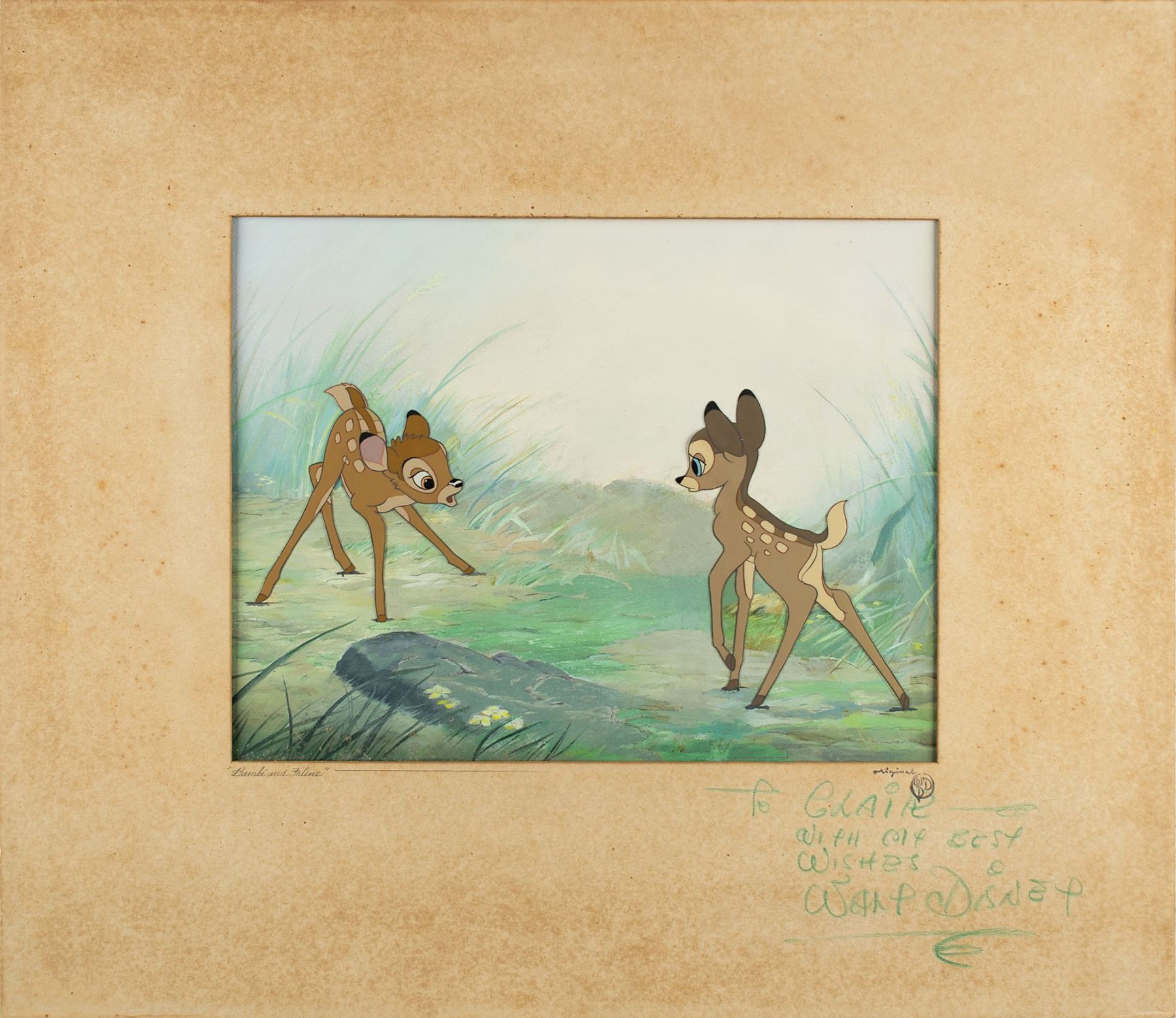 (Walt Disney Studios, 1942) Original production cel and gorgeous oil painting production background of Bambi and Faline from Bambi, signed and inscribed on the mat in green crayon, “To Claire, With My Best Wishes, Walt Disney,” with the encircled Walt Disney Productions “WDP” stamped above and the cel title to left side, “Bambi and Faline.” The cels, which depicts the two fawns during an early meeting, have been trimmed and applied to a stunning oil painting production background. The character images measure 3.5 x 3.75 (Bambi) and 4 x 5 (Faline), with a mat opening of 11 x 8.5. Matted to an overall size of 18.5 x 16. In fine condition, with some toning and spotting to mat. An extremely attractive production display topped off with a large Disney signature.