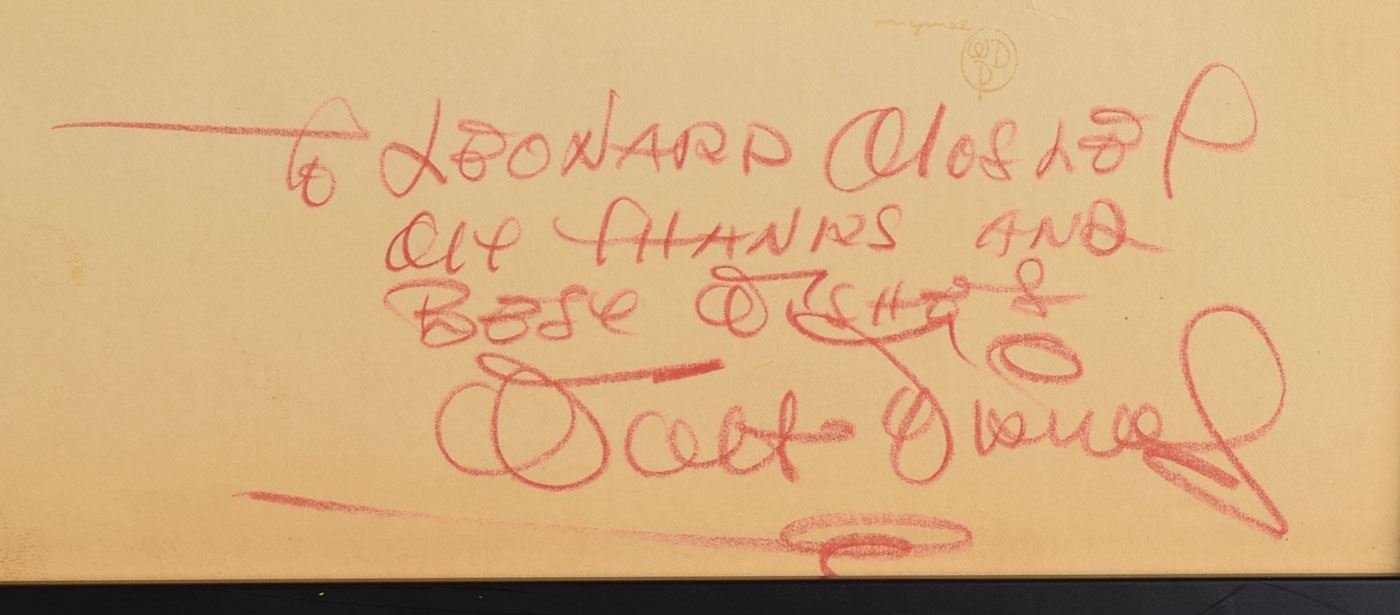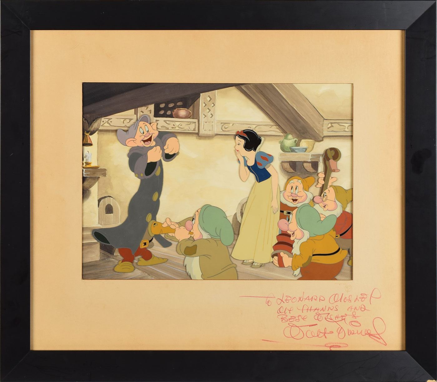(Walt Disney Studios, 1937) Original production cels featuring Snow White, Sleepy, Bashful, Happy, Doc, Dopey, and Sneezy from Snow White and the Seven Dwarfs, showing them all together during the after dinner dance sequence. The cels have been trimmed to image and placed on a hand-painted custom watercolor background, presented in an original mat signed and inscribed in red artist's crayon by Walt Disney, "To Leonard Mosley, My thanks and best wishes, Walt Disney." Character sizes are as follows: Snow White and three dwarfs measures 6.25 x 8; Sleepy, playing an instrument, measures 4.5 x 4; and Dopey standing on Sneezy's shoulders measures 4.5 x 8.25. The mat opening measures 14.25 x 10.5, and the piece is framed to an overall size of 23 x 20. In fine condition. A stunning display piece signed by the legendary creator of Snow White—an enduring film that recently celebrated its 80th birthday.