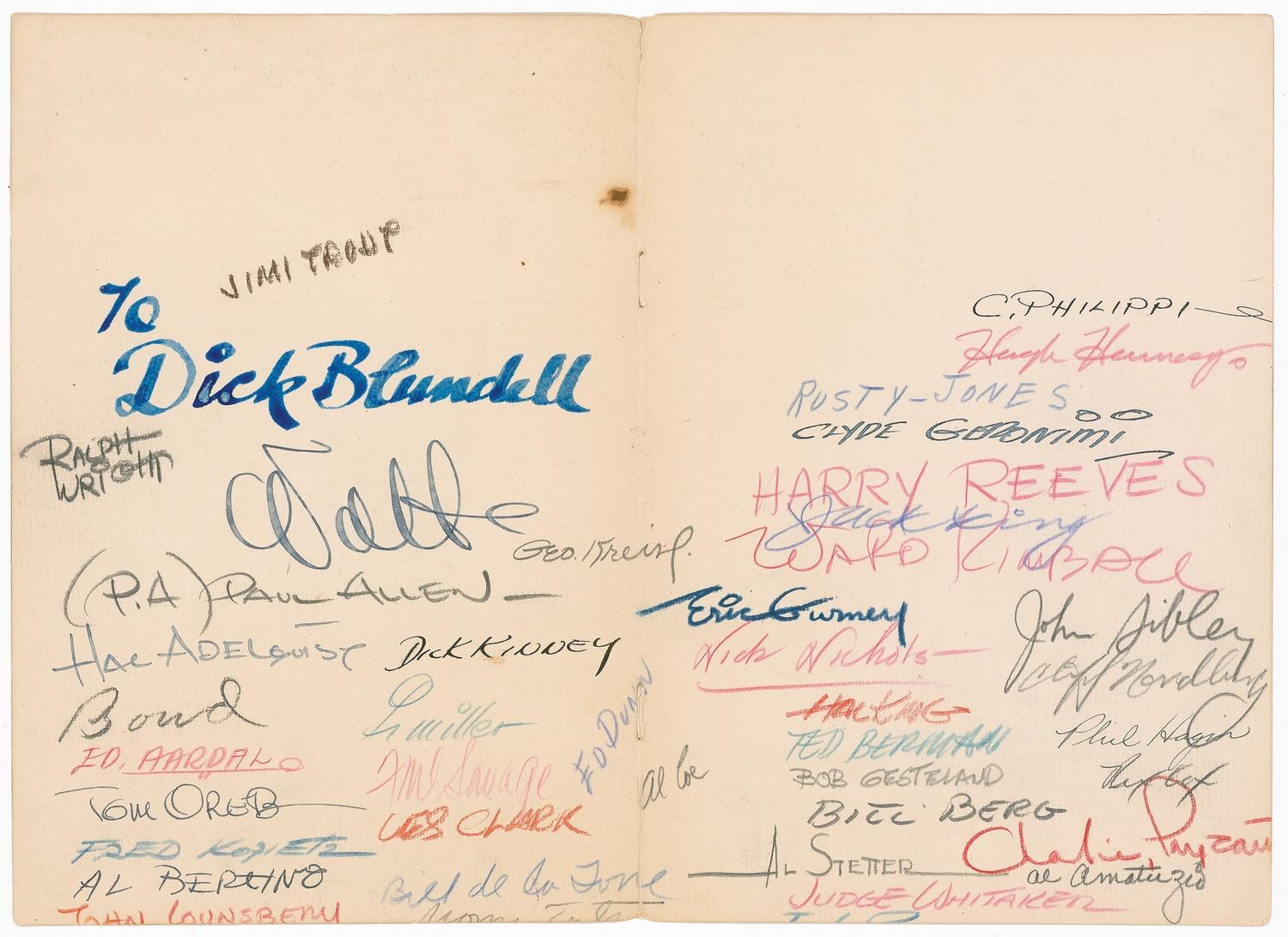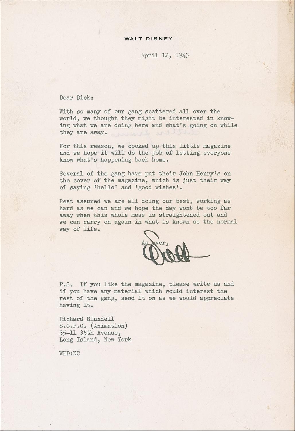 Accompanied by a one-page TLS to Blundell, signed “Walt,” 7.25 x 10.5, personal letterhead, dated April 12, 1943. Disney sends the magazine to Blundell who was serving in the armed forces at the time. In part: “With so many of our gang scattered all over the world, we thought they might be interested in knowing what we are doing here and what’s going on while they are away.