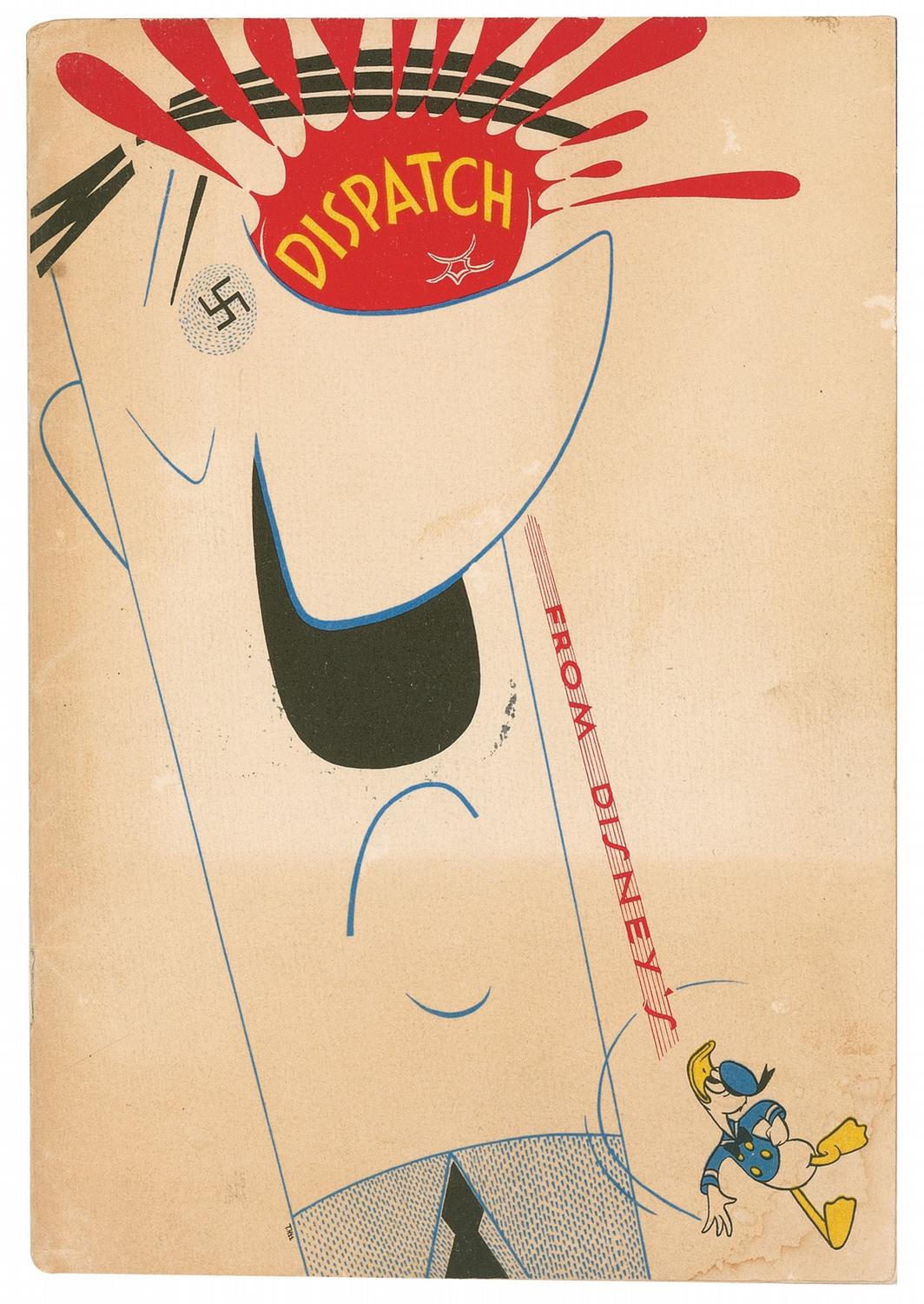 Rare original Dispatch from Disney’s magazine, Volume One, Number One, 5.5 x 8, from 1943. The front cover bears a color image of Donald Duck hitting Adolf Hitler in the eye with a tomato, and the back cover features seven small color images of Disney characters used in military company logos. Inscribed in an unknown hand on the inside front cover “To Dick Blundell,” and signed in fountain pen, “Walt,” and also signed in ink and artist’s pencil on the inside front and back cover by 40 other Disney employees including: Ralph Wright, Paul Allen, Hal Adelouise, Dick Kinney, Bowd, Ed Aardalo, Tom Oreb, Fred Kopietz, Al Bertino, John Lounsbery, Les Clark, L. Miller, Bill del la Tone, Ed Dunn, C. Philippi, Hugh Hennesy, Rusty-Jones, Clyde Geronimi, Harry Reeves, Jack King, Ward Kimball, John Sibley, Nick Nichols, Hal King, Ted Berman, Bob Gesteland, Bill Berg, Al Stetter, and Judge Whitaker. There are also several partial signatures along bottom edge, indicating the cover was probably signed before being bound to the publication.