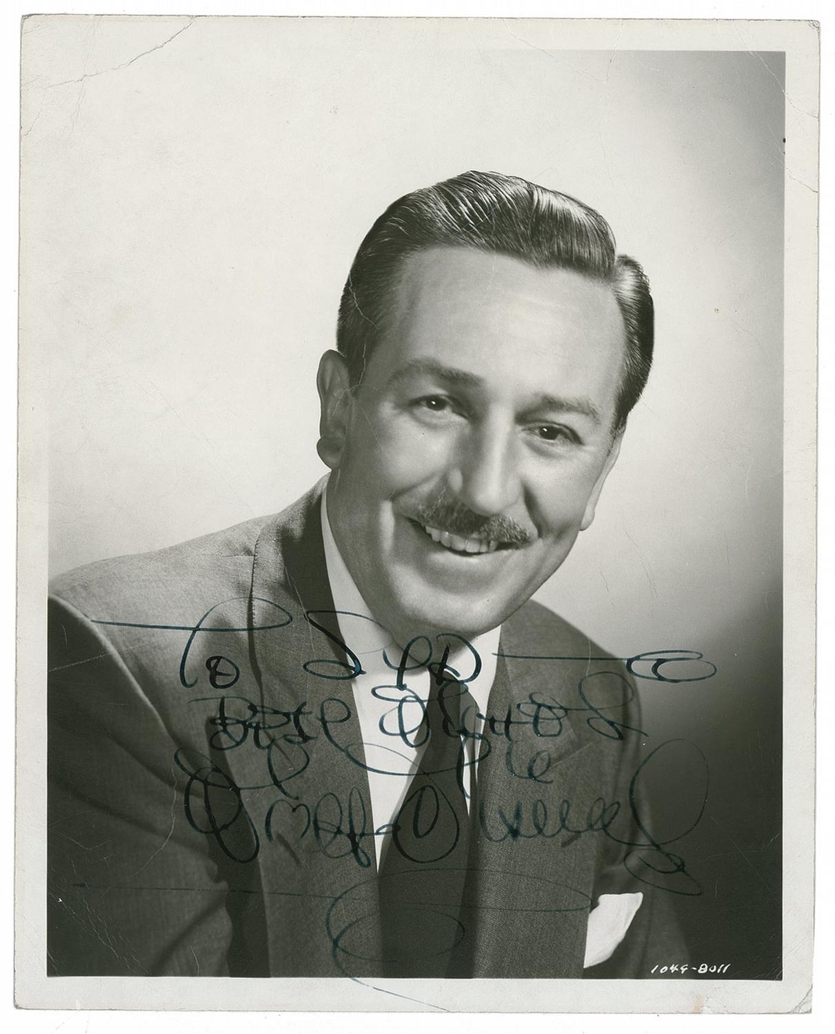 Vintage matte-finish 8 x 10 head-and-shoulders portrait, signed and inscribed in fountain pen “To Syd, Best wishes, Walt Disney.” A bit of light skipping to beginning portion of Disney’s signature, small tear to bottom edge, and moderate overall creasing to image and background, otherwise very good condition.