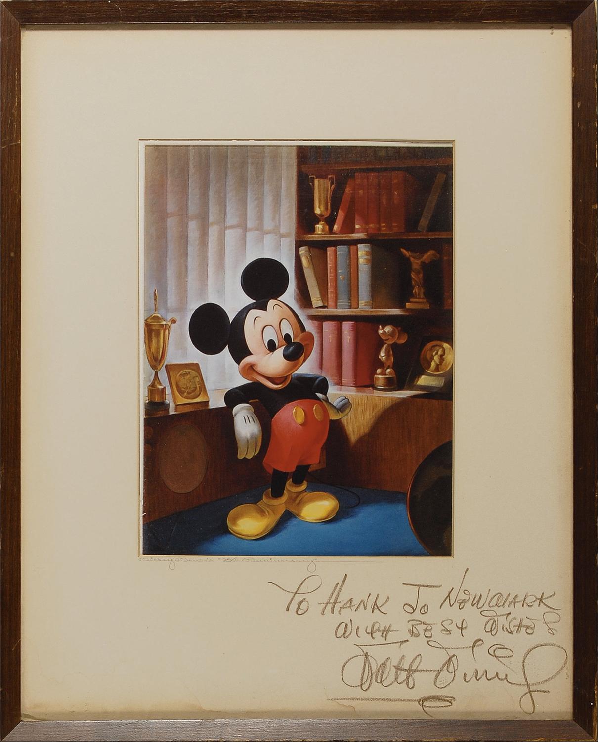 Vibrant color 7.5 x 10 print of Mickey Mouse standing in either an office or a library, with the shelves covered in books and awards, in honor of his twenty-fifth anniversary, done by Disney artist John Hench in 1953, signed and inscribed in brown artist’s pencil by Disney on the cream colored 13.25 x 17 mat, “To Hank Jo Newmark, With best wishes, Walt Disney.” Light pencil notation on mat under print reads, “Mickey Mouse 25th Anniversary.” Framed to an overall size of 14.5 x 18. Back of the item has the original backing which bears the original Disney label stating “This is a reproduction of an original celluloid drawing, actually used in the Walt Disney production of Mickey’s 25th Anniversary. It is one of a select few that have been released.” Print slightly shifted inside mat, a bit of light toning to mat, and some mild toning and damp staining along bottom edge, barely affecting a small portion of Disney’s signature, otherwise fine condition. The print’s recipient was a commercial artist in the Philadelphia area, who received the print from a friend who was a Disney studio artist. A nicely signed item, uncommon to be found with the original print and frame backing still intact.