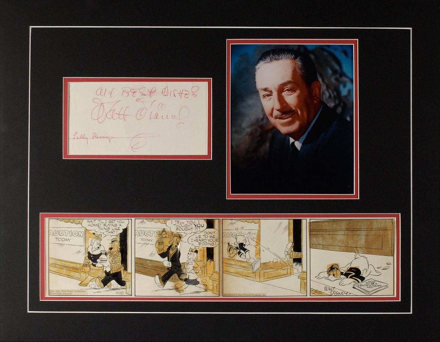 Large felt tip signature, “All Best Wishes, Walt Disney,” on an off-white 8.5 x 4.5 card, also signed by his wife Lillian, signing along her husband’s paraph. Double matted with a color portrait of Disney and an original hand-inked four panel Disney daily comic strip from 1941, done and signed “Walt Disney” in an artist’s hand, to an overall size of 27.25 x 21.5. In fine condition, with a brush to single word of sentiment and a bit of trivial soiling. Disney’s bright red signature measures an impressive six inches in length. Oversized.
