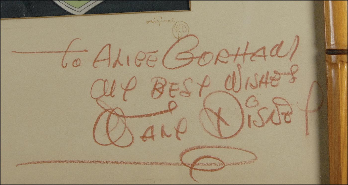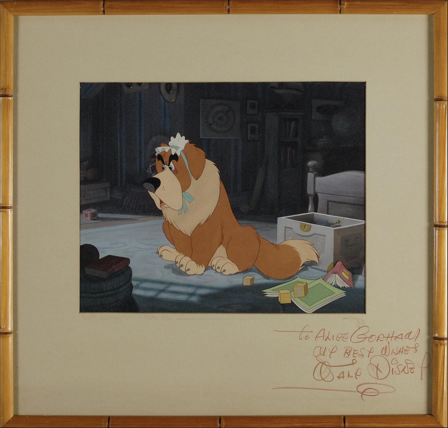 Colorful original hand-painted animation cel of the Darling’s nursemaid Nana sitting in the nursery amid books and building blocks. The cel has been trimmed to the outline of the figures, as was customary when being prepared for presentation, and is set against a specially prepared color background of the children’s nursery. Cel is housed in its original cream 18.25 x 17.25 mat with the pencil caption “Walt Disney’s ‘Peter Pan” and the red “Original WDP” ink stamp; the mat is boldly signed and inscribed in red artist’s pencil, “To Alice Gorham, All best wishes, Walt Disney.” Framed to an overall size of 19.5 x 18.5. In fine, clean condition. An extremely well-preserved cel and signature from one of Disney’s timeless classics, which incidentally was the final Disney film in which all nine members of Disney's Nine Old Men worked together as directing animators.