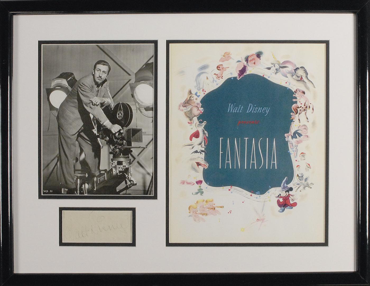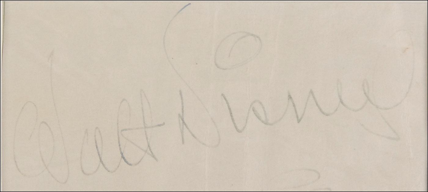 Vintage fountain pen signature, “Walt Disney,” on an off-white album page. Archivally double matted with an unsigned portrait of Disney and an original cover from a Fantasia program to an overall size of 23 x 18. In very good condition, with signature a shade or two light, but completely legible, several vertical creases through letters of signature, and some light toning and wrinkling.