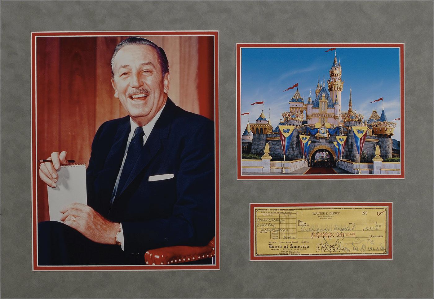 Personal check, 8.5 x 3.25, filled out in another hand and signed by Disney, “Walter E. Disney,” payable to Orthopedic Hospital for $500.00, stamp-dated December 18, 1950. Double suede matted with a color portrait of Disney and an image of one of Disney’s castles, to an overall size of 26 x 18. In very good condition, with two vertical folds, one through a single letter of signature, cancellation holes over first name of signature, a red notation to top right and light show-through from stamps on reverse. Oversized.