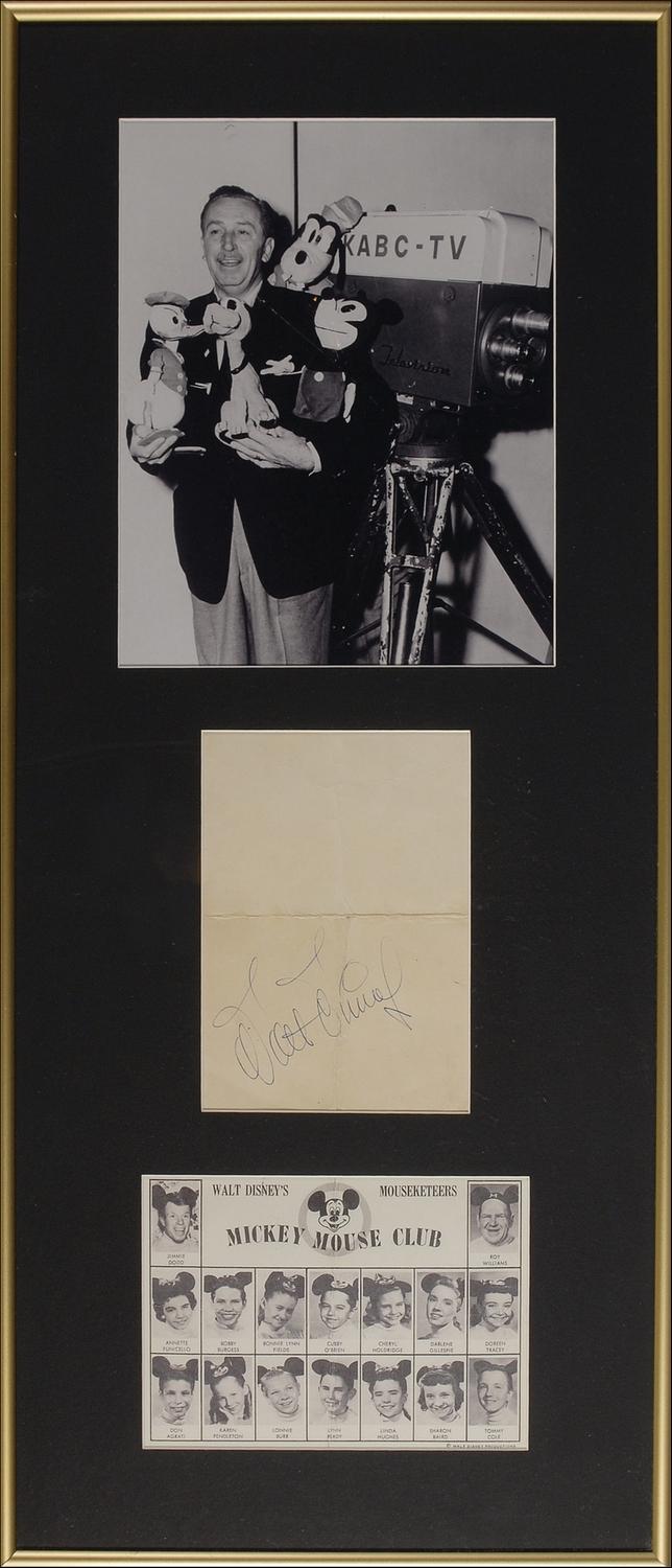 Original vintage 7 x 5 Mickey Mouse Club fan card, featuring all 14 child Mouseketeers as well as their two adult counterparts, Jimmy Dodd and Roy ‘The Big Moose-keteer’ Williams, on the front, and signed on the reverse in blue ballpoint, “Walt Disney.” Matted and framed, so both sides can be viewed, along with a photocopy of the front and a glossy photo of Disney holding several stuffed toys in front of a KABC television camera, to an overall size of 12 x 28. Central horizontal and vertical fold, with vertical fold through two letters of signature, and mild toning over signature, otherwise fine condition. Oversized.