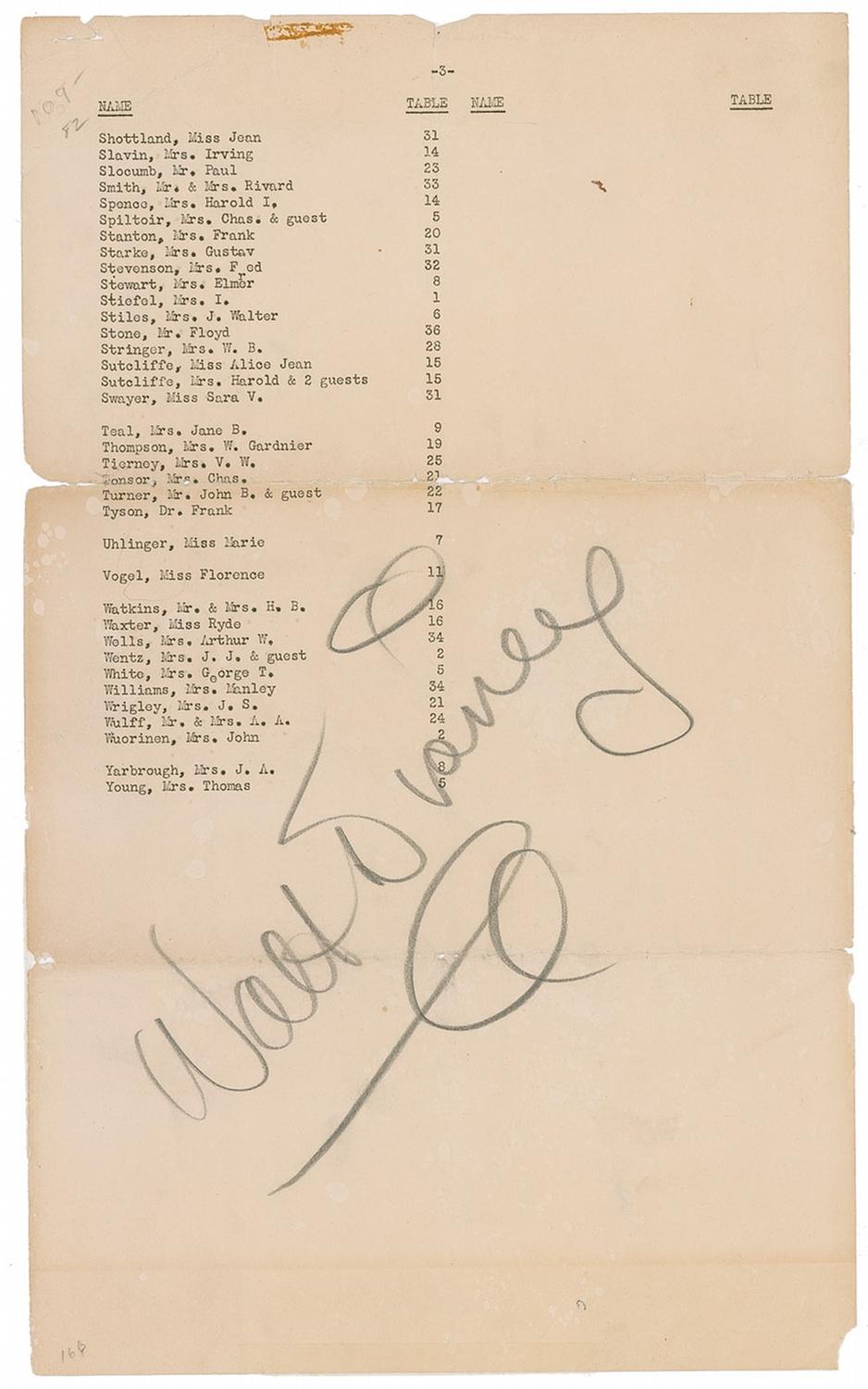 Bold pencil signature, “Walt Disney,” on an off-white 8.5 x 14 sheet of seating assignments from an event. In very good condition, with horizontal fold passing through his first name and paraph, scattered tears and separation along the folds, uniform toning, adhesive staining at the extreme top edge and the end of his name overlapping printed text. Disney’s signature stretches 7.5 inches across the page!