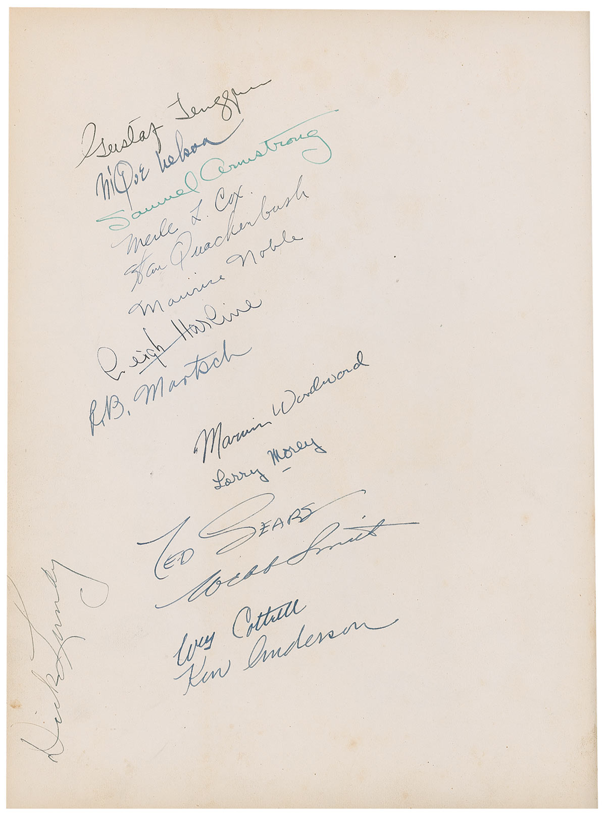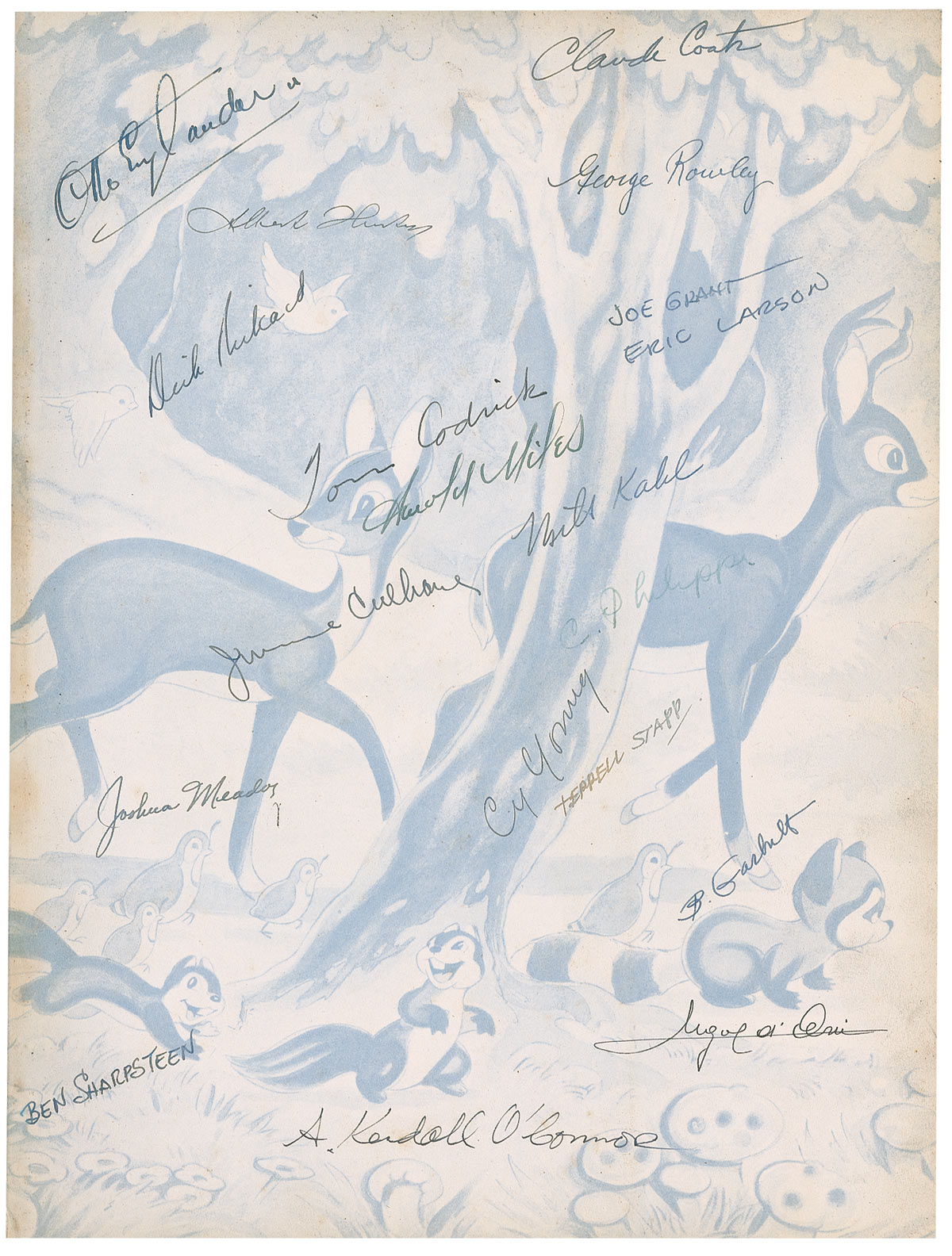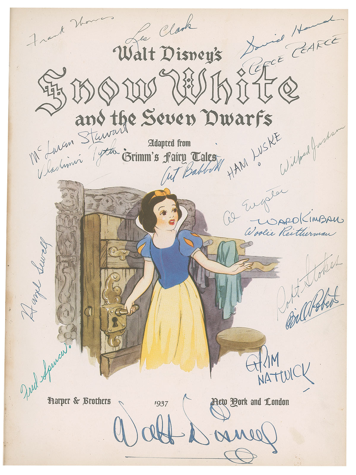 Signed book: Snow White and the Seven Dwarfs. First edition. NY: Harper & Brothers, 1937. Hardcover with dustjacket, 9.5 x 13, 79 pages. Boldly signed in fountain pen on the title page “Walt Disney.” That page, the first free end page, and the last free end page are also signed in ink by 51 of the 64 people officially credited on the movie, and includes six of the nine men later referred to by Disney as the ‘nine old men’ —Les Clark, Milt Kahl, Ward Kimball, Eric Lawson, Woolie Reitherman and Frank Thomas. In addition, it includes character designers Albert Hurter and Joe Grant, art directors Charles Phillippi, Terrell Stapp, McLaren Stewart, Harold Miles, Gustav Tenggren, Ken Anderson, Kendall O’Connor, and Hazel Sewell and supervising animators Ham Luske and Vladimir Tytla. Other signers include Joshua Meados, Ben Sharpsteen, Otto Englander, Dick Rickard, Grim Natwick, Fred Spencer, Bill Roberts, Robert Stokes, Wilfred Jackson, Art Babbitt, Al Engsten, Dick Lundy, Webb Smith, Ted Sears, Larry Morey, Marvin Woodward, R. B. Martsch, Leigh Harline, Maurice Noble, Stan Quackenbush, Merle L. Cox, Samuel Armstrong, Claude Coats, and George Rowley. Light wrinkling to the paper on the front cover, edge wear, corner dings, and some faint toning to the pages, otherwise fine condition.