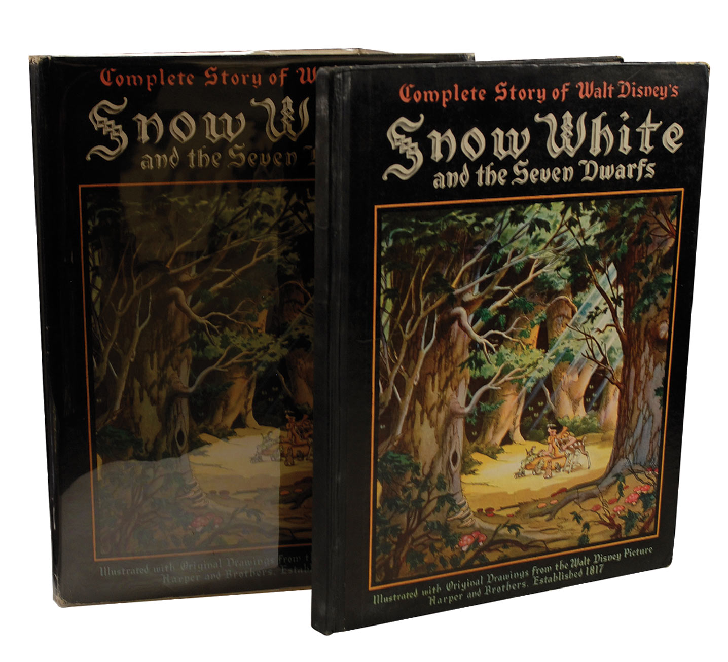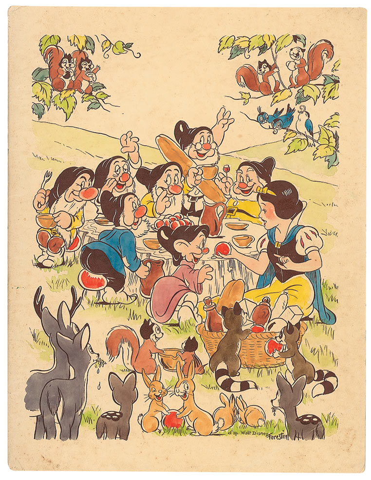 As a promotion for the 1938 RKO Radio Pictures International Convention, Disney had copies of the book Snow White and the Seven Dwarfs, published by Harper and Brothers in 1937, brought to the his studios, where he and 51 of the principal creators of the film signed them as gifts for the prospective distributors. Disney signed boldly at the bottom of the title page and instructed the animators to sign on the title page and on the front flyleaf, with this example one of only three still known to exist.