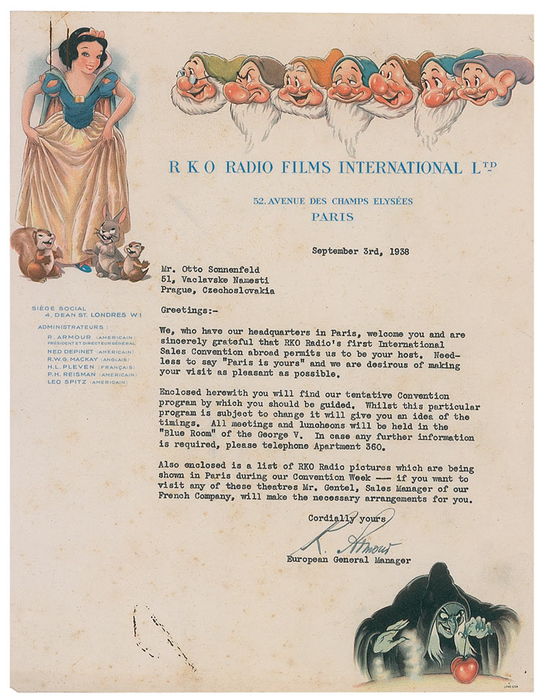Amazingly, this convention...and Snow White...can also be credited with saving the life of Sonnenfeld, who was Jewish! When he returned to Nazi-dominated Czechoslovakia, the distribution contract he secured for Snow White allowed him to leave his homeland and gain entry to British-controlled Palestine with a document known as a capitalist certificate, recognizing him as the RKO Pictures distributor for Palestine. In later years, Sonnenfeld and his wife credited the RKO convention and the success of Snow White with saving their lives. It is believed that most of the special copies of this book that were shipped to Paris never left Europe and were destroyed during World War II. A remarkably rare collection, not only for the prominent signatures and paperwork, but for the role these items played in saving a human life from Nazi tyranny!