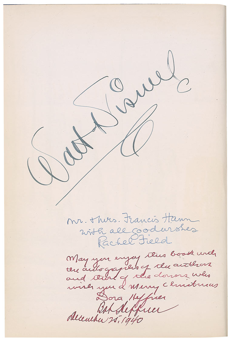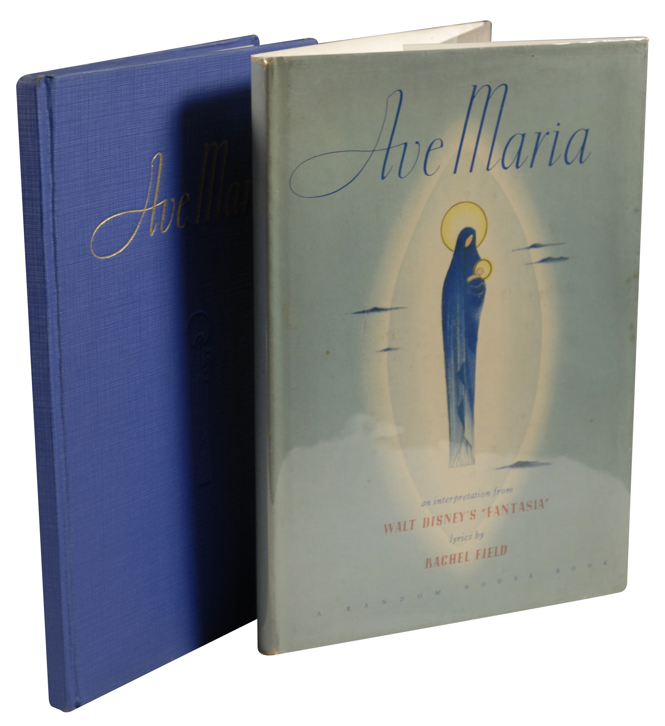 Signed book: Ave Maria: An Interpretation from Walt Disney’s ‘Fantasia.’ First edition. NY: Random House, 1940. Hardcover with dustjacket, 7.5 x 10.5. Boldly signed in fountain pen opposite the title page “Walt Disney” and signed and inscribed by lyricist Rachel Field. The page also bears two gift presentation signatures. In fine condition, with a bit of edge toning to the pages, corner bumps, and light wear to the dustjacket.