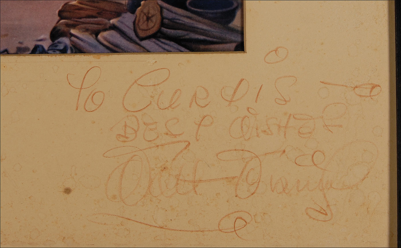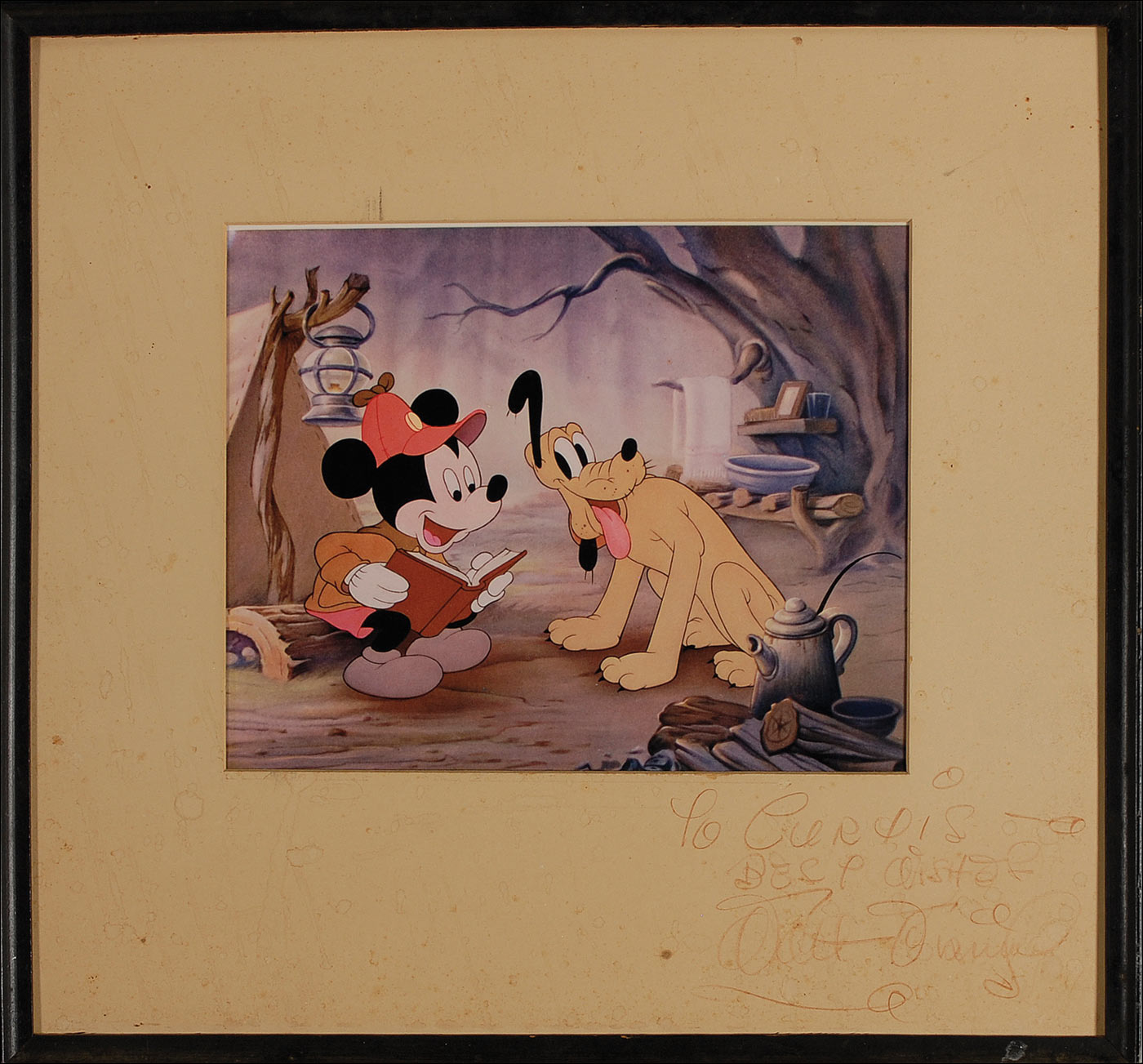 Original 15.75 x 15 mat signed and inscribed in artist pencil, “To Curtis—Best Wishes of Walt Disney.” The mat is displayed with a modern-era color print of Mickey Mouse and Pluto and framed to an overall size of 16.75 x 15.75. Uniform toning, some fading of the signature and sentiment, and mild to moderate soiling and staining affecting the signature, otherwise very good condition.