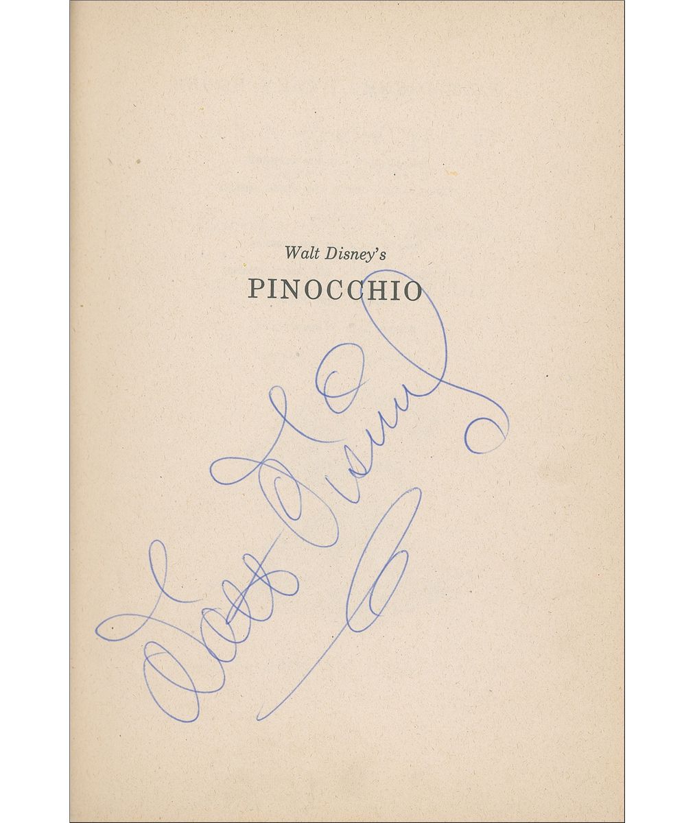Signed book: Pinocchio. Later printing. Boston: D. C. Heath and Company, 1940. Hardcover, 6.25 x 8.5, 90 pages. Signed on the half-title page in blue ballpoint. A couple light vertical creases and some mild toning to signed page, owner’s notations to pastedowns and first free end page, light soiling to inside pages, both hinges a bit loose, and scattered soiling, wear, and toning to covers and spine, otherwise very good condition.