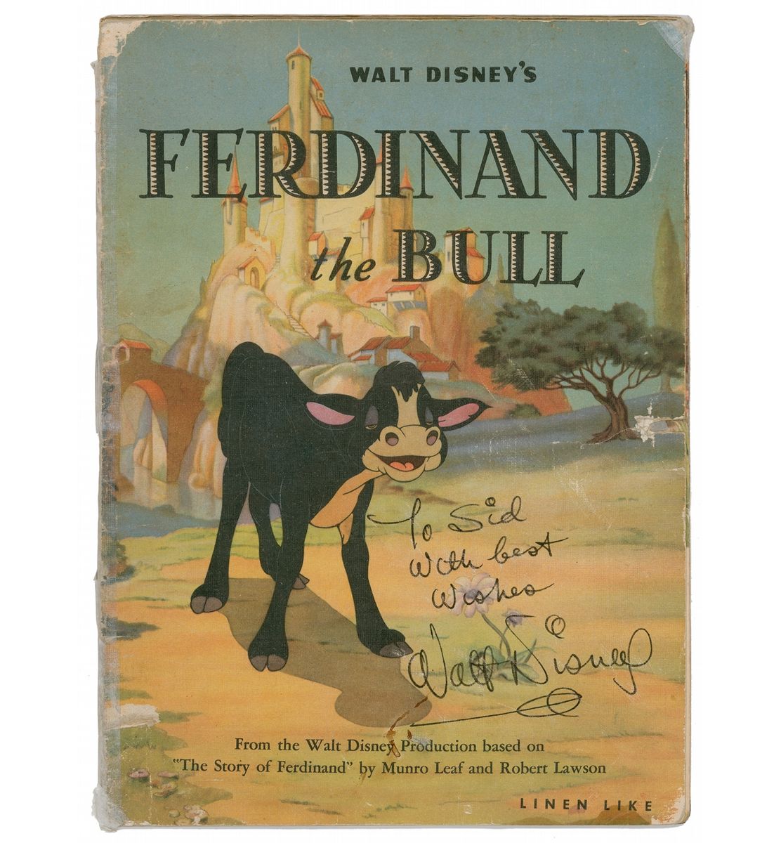 Signed book: Ferdinand the Bull. Wisconsin: Whitman Publishing Company, 1938. Softcover, 9 x 12. Signed and inscribed in black ink on the cover, “To Sid, with best wishes, Walt Disney.” In good to very good condition, with a small tear and some scattered surface loss to front and back cover, tape reinforced spine, inside pages separated from covers, scattered toning and soiling to inside pages, and some light staining along right edge of front cover.