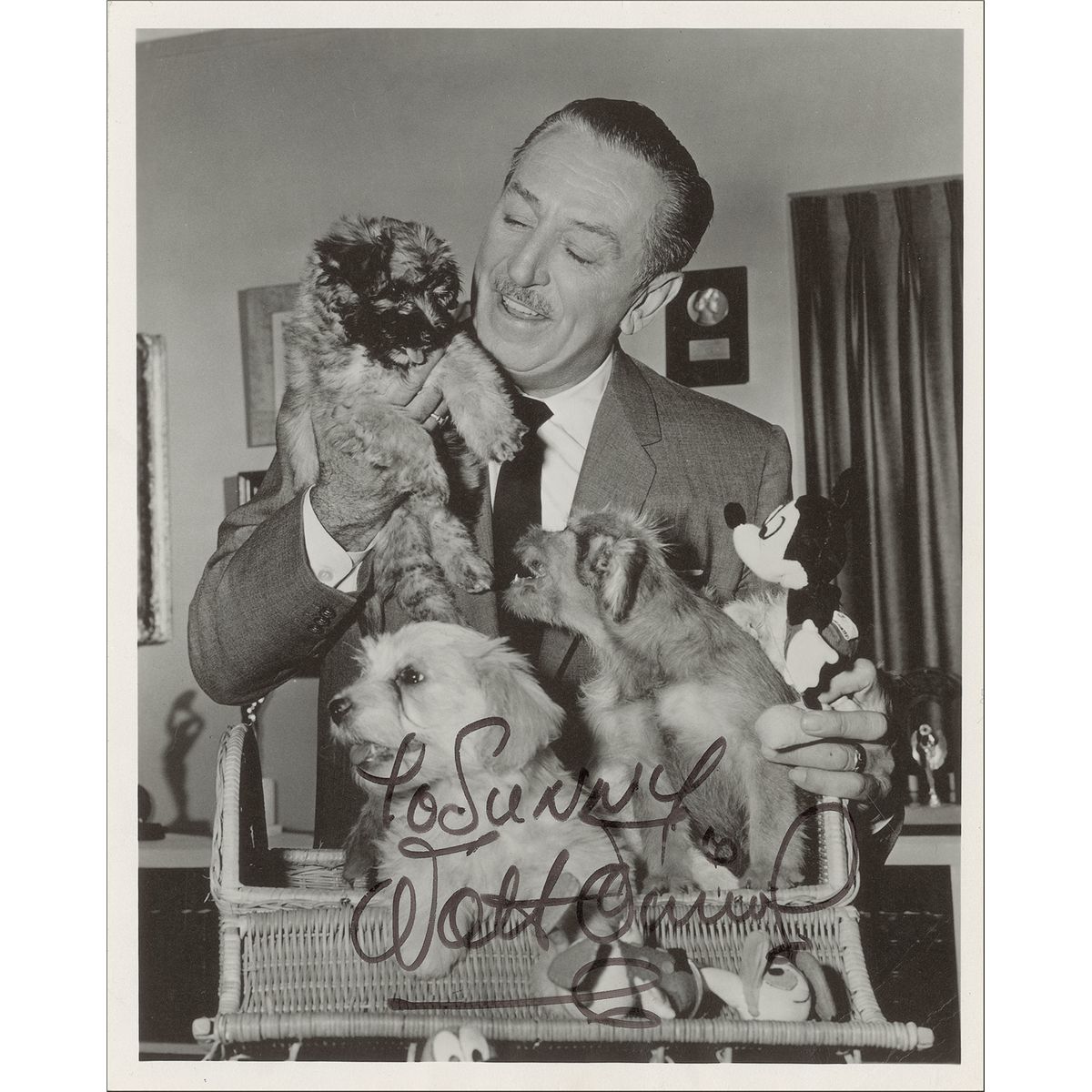 Vintage matte-finish 8 x 10 photo of Disney with a basket full of puppies in front of him, with Mickey Mouse tucked in his hand and Donald Duck lying in the basket, with a shelf of Disney’s awards visible in the background, signed and inscribed in black felt tip “To Sunny, Walt Disney.” Mild rippling and creasing to three edges, and some creasing to lower right corner, otherwise fine condition. Signed photos of Disney posing with any incarnation of Mickey are quite rare.
