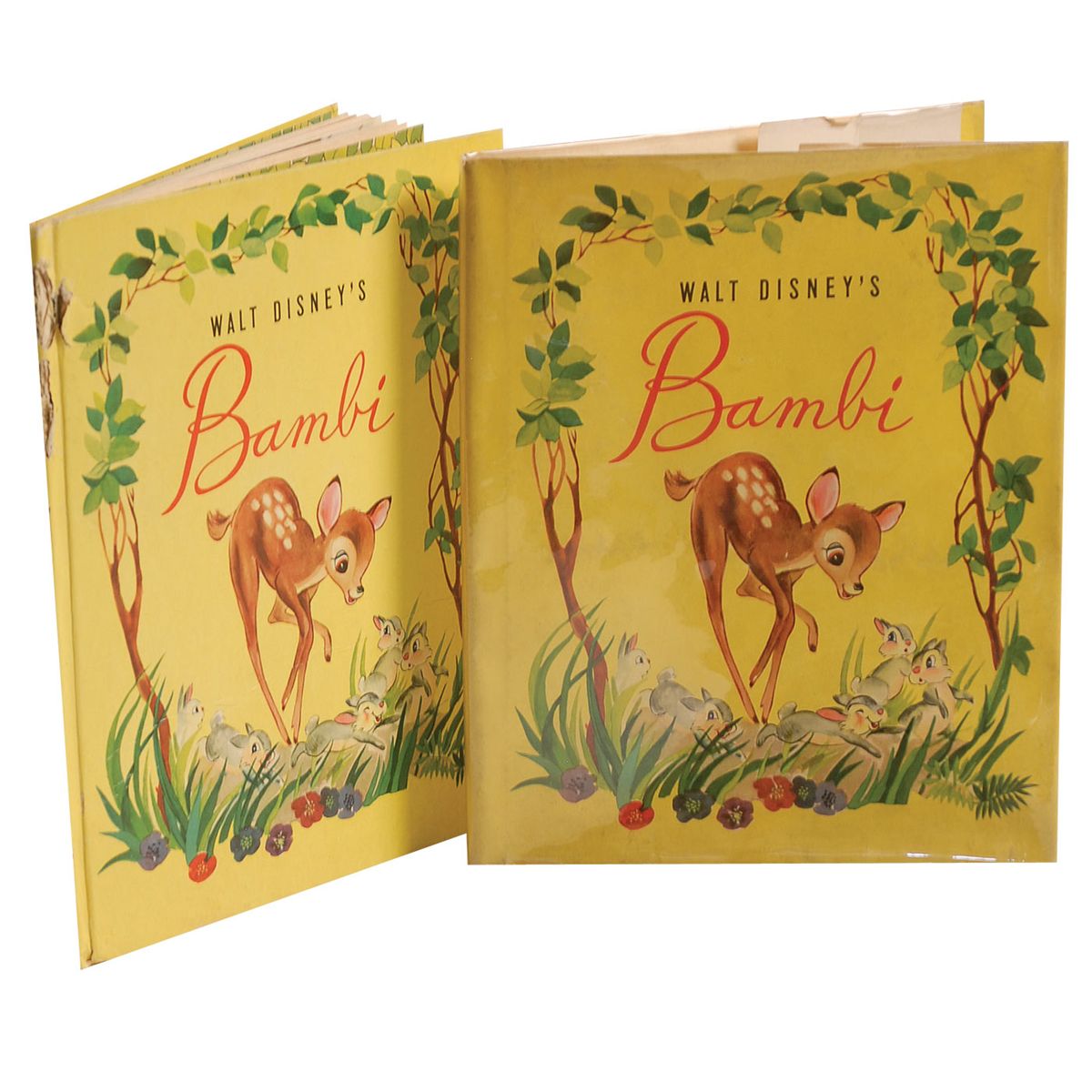 Signed book: Walt Disney’s Bambi. Later printing. NY: Grosset and Dunlap. 1942. Hardcover with dustjacket, 7 x 8.5. Signed and inscribed in purple crayon on the reverse of the first free-end page, “To Jimmie Carpenter, Best wishes, Walt Disney.” In very good condition, with partial separation to front hinge along signed page, mild toning to inside pages, spine a bit loose, creasing to front board, cover loss along spine, and scattered wear and light soiling to dustjacket.