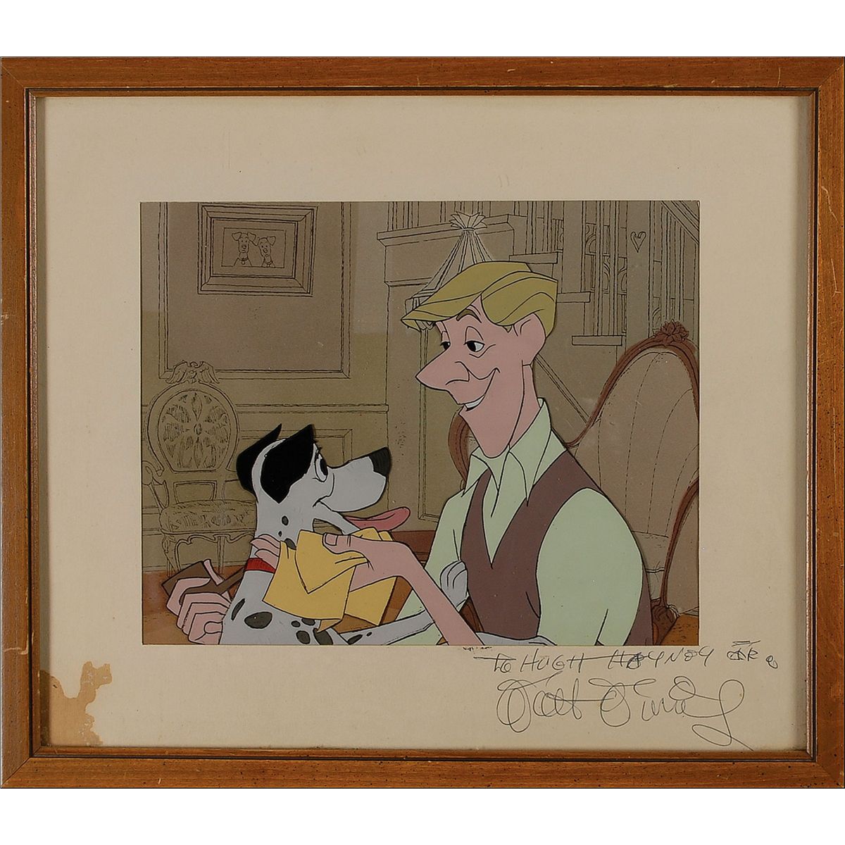 Original hand-painted animation cel from Disney’s 1961 production of 101 Dalmatians, showing Pongo and Roger in the parlor, and set against a specially prepared color background. The untrimmed visible image of the cel measures 9.75 x 8, and is housed in its original 13.5 x 11.5 mat. Signed and inscribed on the mat in blue ballpoint, “To Hugh Hayney Jr., Walt Disney.” Framed to an overall size of 15 x 13. Light rippling to cel, a few cracks to the paint, and staining to lower left corner of mat, otherwise fine condition. Accompanied by a letter of provenance from the daughter-in-law of the original recipient, political cartoonist Hugh Haynie. In full: “This cel was signed by Walt Disney in my father-in-law’s presence during an editorial cartoonist convention in Disneyland. My father-in-law, Hugh Haynie, was a very well known political cartoonist. During the convention, Hugh asked Walt Disney to sign a cel as a gift to his son, Hugh Smith Haynie, Jr. He did sign the cel but misspelled Haynie. Therefore, he signed another cel simply addressed to Hugh Jr.”