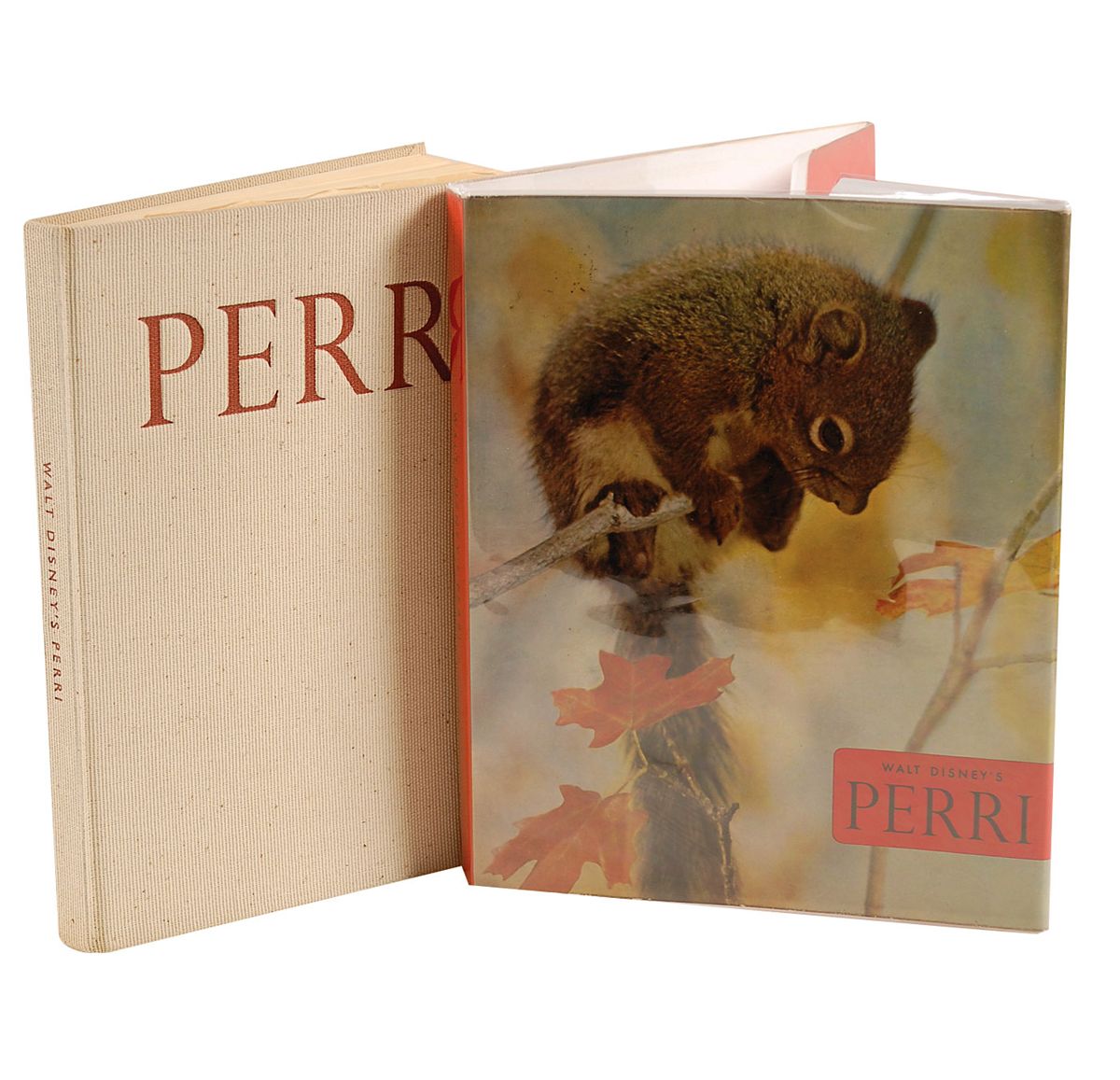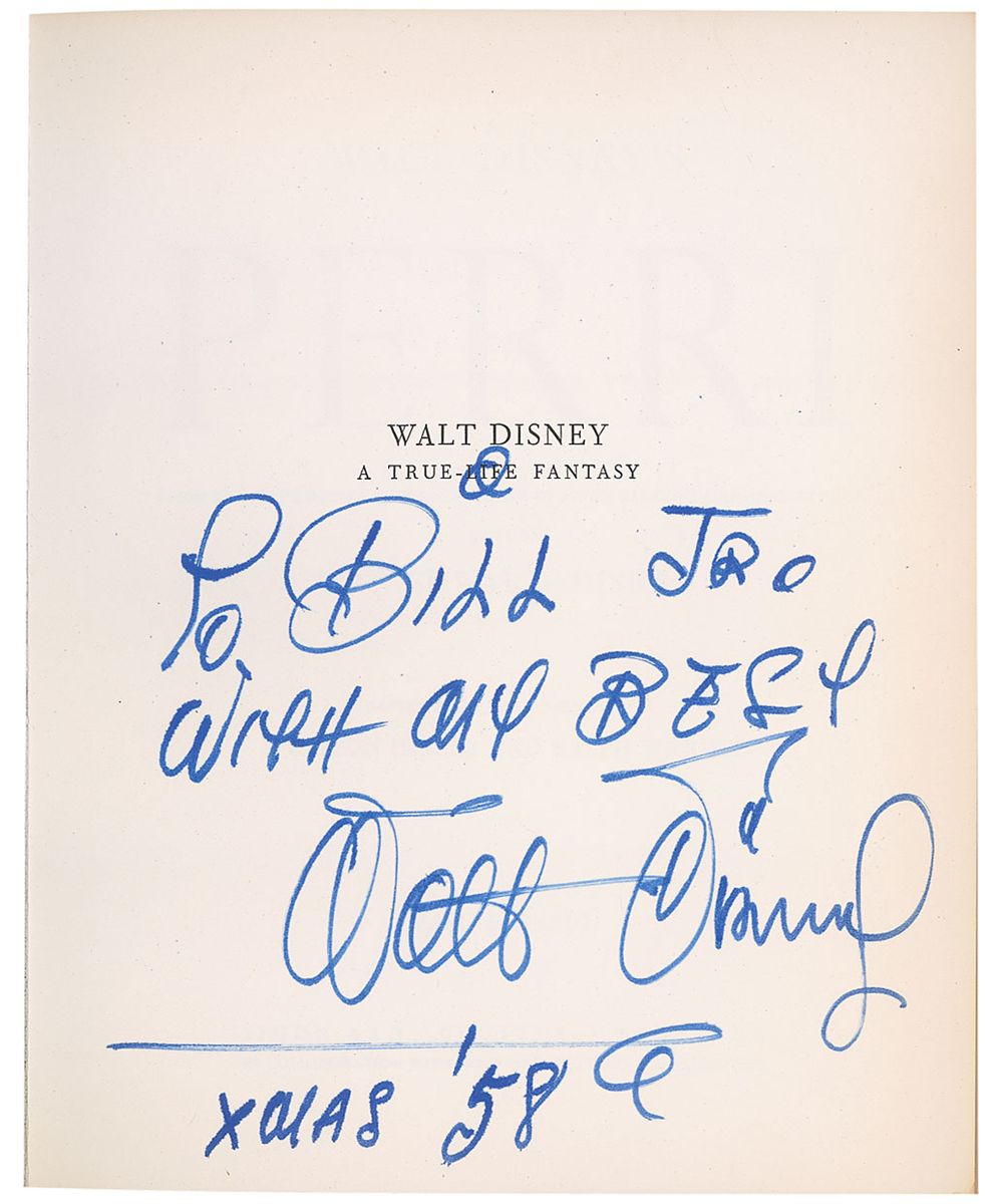 Signed book: Perri. First edition. NY: Simon & Schuster, 1958. Hardcover with dustjacket, 8 x 10, 78 pages. Signed and inscribed on the half-title page in blue felt tip, “To Bill Jr. with my best, Walt Disney Xmas ‘58.” In fine condition, with some mild toning to signed page and both pastedowns and some scattered light wear to dustjacket.
